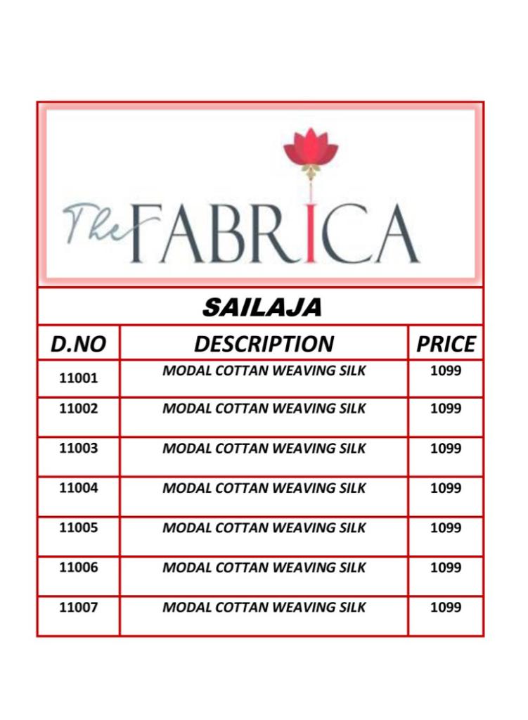 Buy Online Sailaja Series 11001 To 11006 By The Fabrica 6 Pcs of Full Catalogue at Wholesale Price. Looking for Sailaja Series 11001 To 11006 By The Fabrica Full Catalouge at Best Price? Buy Now Sailaja Series 11001 To 11006 By The Fabrica at Wholesale Rate of Rs 6594 with Total 6 Pcs from authroized dealer and supplier of Brand. Cost of Each piece is just only Rs 1099 which is very low and affordable price to resale the product in your retail store ,This is Surat based Wholesale Supplier & Dealer of Brand. Click on Brand name to Know more about Brand's products.Call or Whatsapp on 9898838984 for booking or enquiry