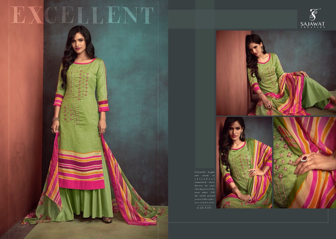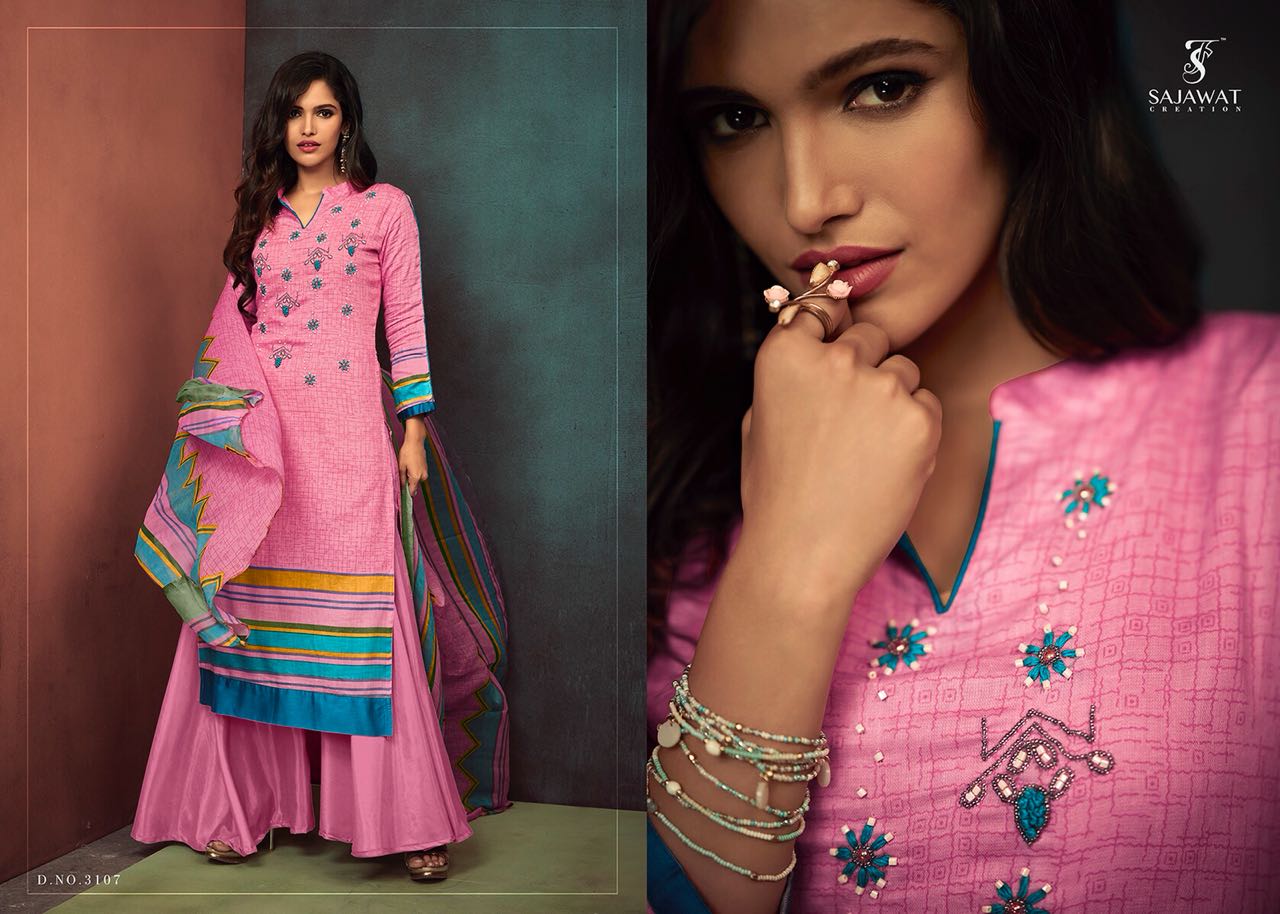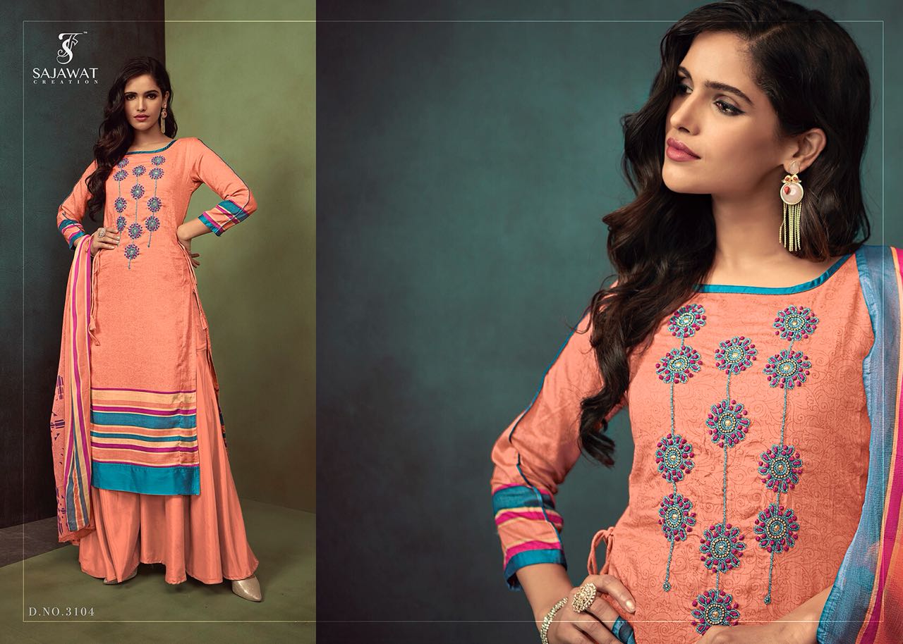 Buy Online Sajawat Creation Noor 3101 Series Cotton Satin Plazo Salwar Kameez Catlog Wholesale Dealer And Supplier Surat 8 Pcs of Full Catalogue at Wholesale Price. Looking for Sajawat Creation Noor 3101 Series Cotton Satin Plazo Salwar Kameez Catlog Wholesale Dealer And Supplier Surat Full Catalouge at Best Price? Buy Now Sajawat Creation Noor 3101 Series Cotton Satin Plazo Salwar Kameez Catlog Wholesale Dealer And Supplier Surat at Wholesale Rate of Rs 5200 with Total 8 Pcs from authroized dealer and supplier of SAJAWAT Brand. Cost of Each piece is just only Rs 650 which is very low and affordable price to resale the product in your retail store ,This is Surat based Wholesale Supplier & Dealer of SAJAWAT Brand. Click on Brand name to Know more about SAJAWAT Brand's products.Call or Whatsapp on 9898838984 for booking or enquiry