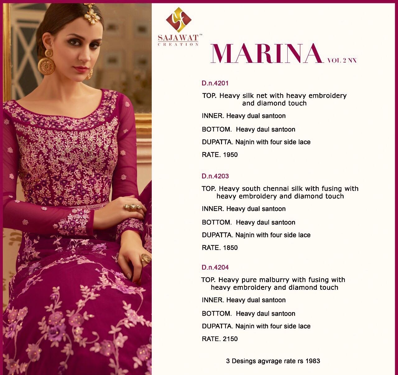 *SAJAWAT CREATION SFÂ??* *Thanks for your loveand support *Presenting our new catalogue* Marina -2 hit deisngs *. Marina -2 nx Set & Loose : GST 5 Percent Extra *Designs: 3. Deisngs *Dispatching- 10 April *Regards* Sajawat creation *SAJAWAT CREATION* ( *Sajawat Group* ) For singles price call or whatsapp on +919898838984 |