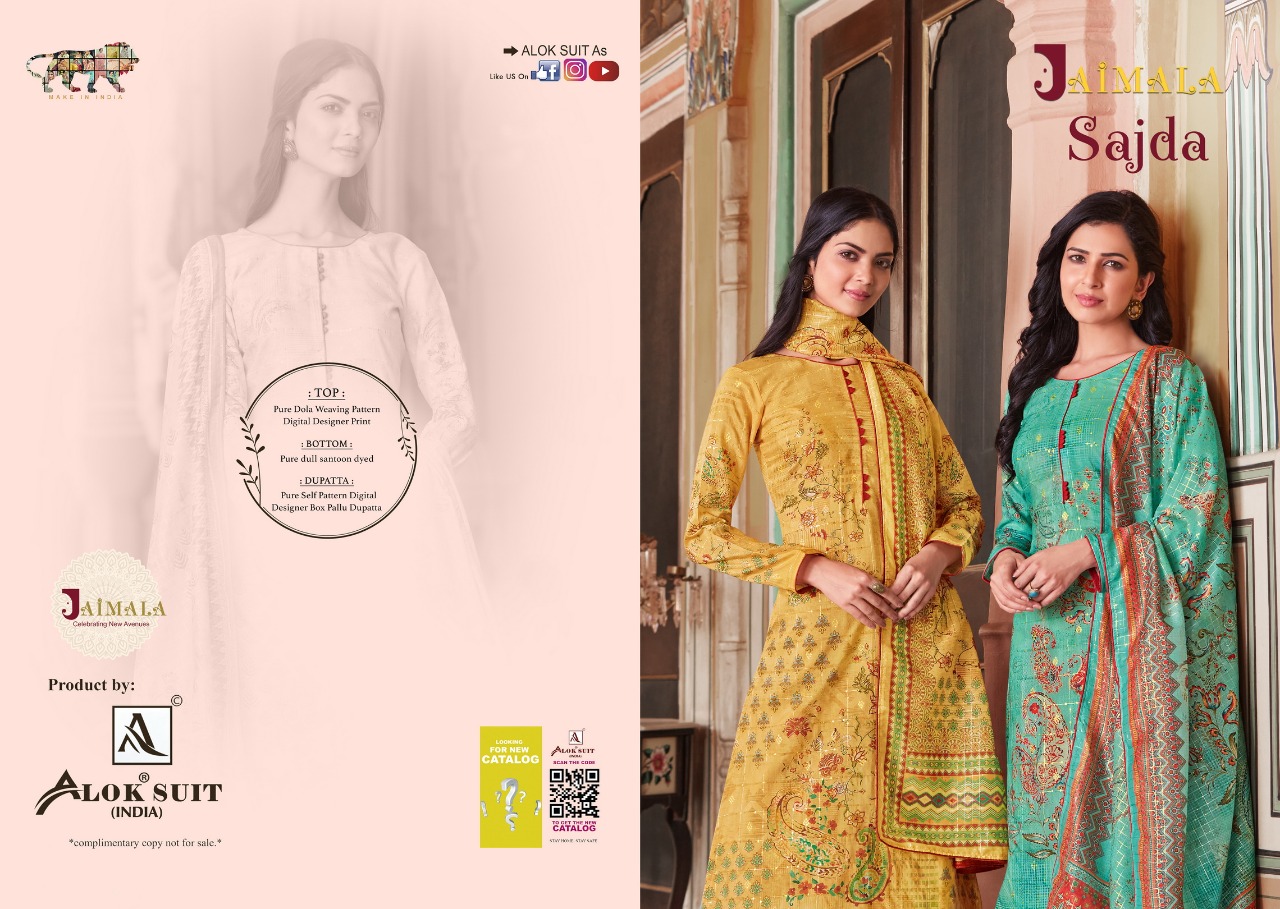 Buy Online Sajda By Jaimala By Alok Suit Wholesale Supplier Traders In Surat 6 Pcs of Full Catalogue at Wholesale Price. Looking for Sajda By Jaimala By Alok Suit Wholesale Supplier Traders In Surat Full Catalouge at Best Price? Buy Now Sajda By Jaimala By Alok Suit Wholesale Supplier Traders In Surat at Wholesale Rate of Rs 4050 with Total 6 Pcs from authroized dealer and supplier of Brand. Cost of Each piece is just only Rs 675 which is very low and affordable price to resale the product in your retail store ,This is Surat based Wholesale Supplier & Dealer of Brand. Click on Brand name to Know more about Brand's products.Call or Whatsapp on 9898838984 for booking or enquiry
