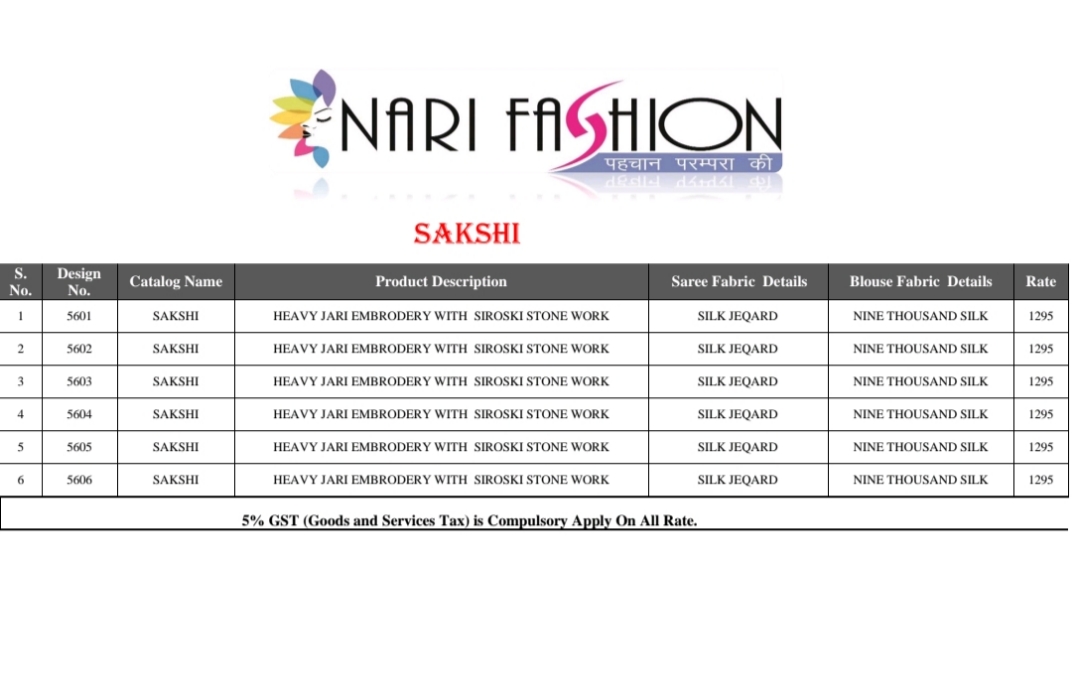 Buy Online Sakshi Series 5601 To 5606 By Nari Fashion Single And Set Stockiest And Supplier From Surat 6 Pcs of Full Catalogue at Wholesale Price. Looking for Sakshi Series 5601 To 5606 By Nari Fashion Single And Set Stockiest And Supplier From Surat Full Catalouge at Best Price? Buy Now Sakshi Series 5601 To 5606 By Nari Fashion Single And Set Stockiest And Supplier From Surat at Wholesale Rate of Rs 7770 with Total 6 Pcs from authroized dealer and supplier of Nari Fashion Brand. Cost of Each piece is just only Rs 1295 which is very low and affordable price to resale the product in your retail store ,This is Surat based Wholesale Supplier & Dealer of Nari Fashion Brand. Click on Brand name to Know more about Nari Fashion Brand's products.Call or Whatsapp on 9898838984 for booking or enquiry