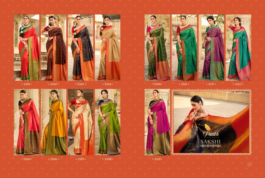 Buy Online Sakshi Silk By Pankh Banarasi Katan Silk Saree 13 Pcs of Full Catalogue at Wholesale Price. Looking for Sakshi Silk By Pankh Banarasi Katan Silk Saree Full Catalouge at Best Price? Buy Now Sakshi Silk By Pankh Banarasi Katan Silk Saree at Wholesale Rate of Rs 29575 with Total 13 Pcs from authroized dealer and supplier of Brand. Cost of Each piece is just only Rs 2275 which is very low and affordable price to resale the product in your retail store ,This is Surat based Wholesale Supplier & Dealer of Brand. Click on Brand name to Know more about Brand's products.Call or Whatsapp on 9898838984 for booking or enquiry