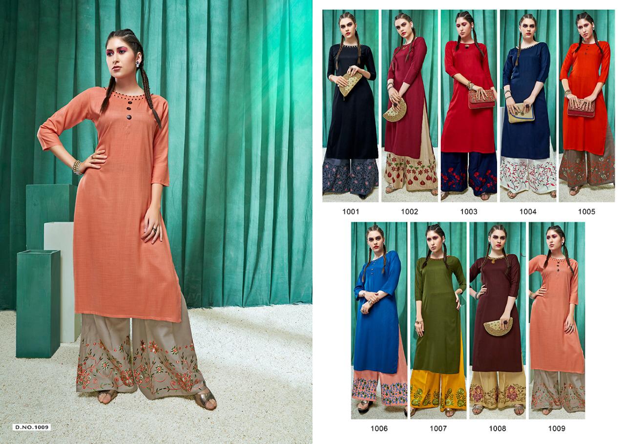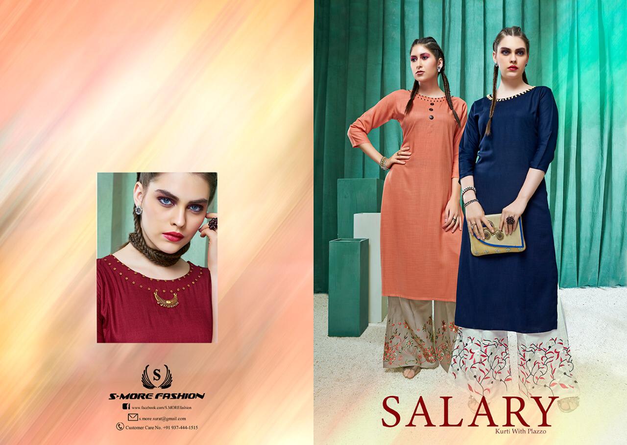 Buy Online Salary By S More Fashion 1001 Series Fancy Reyon Slub Kurti With Plazzo Collection Wholesaler Surat 9 Pcs of Full Catalogue at Wholesale Price. Looking for Salary By S More Fashion 1001 Series Fancy Reyon Slub Kurti With Plazzo Collection Wholesaler Surat Full Catalouge at Best Price? Buy Now Salary By S More Fashion 1001 Series Fancy Reyon Slub Kurti With Plazzo Collection Wholesaler Surat at Wholesale Rate of Rs 6255 with Total 9 Pcs from authroized dealer and supplier of S MORE FASHION Brand. Cost of Each piece is just only Rs 695 which is very low and affordable price to resale the product in your retail store ,This is Surat based Wholesale Supplier & Dealer of S MORE FASHION Brand. Click on Brand name to Know more about S MORE FASHION Brand's products.Call or Whatsapp on 9898838984 for booking or enquiry