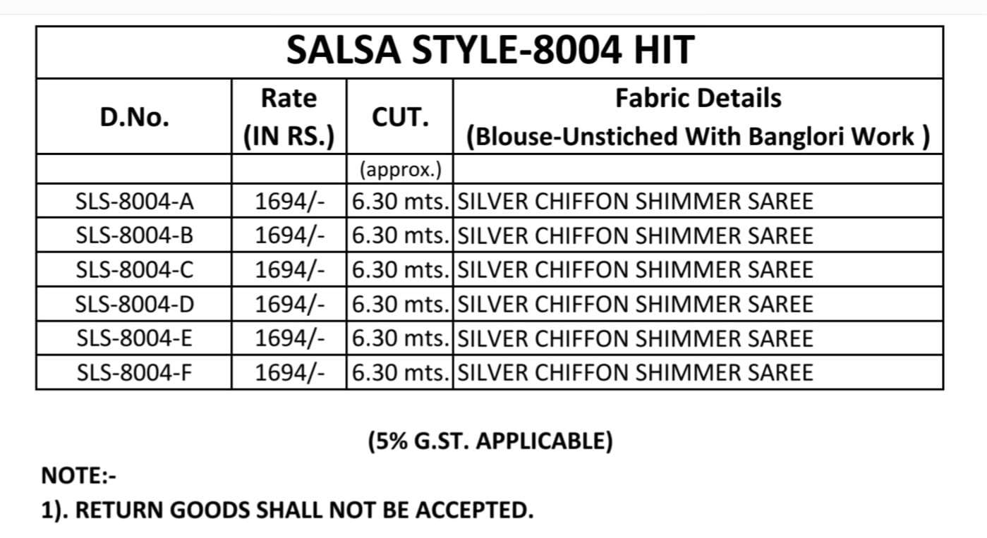 Buy Online SALSA STYLE SERIES 8004A TO 8004D By tfh saree Collection manufacturer surat 6 Pcs of Full Catalogue at Wholesale Price. Looking for SALSA STYLE SERIES 8004A TO 8004D By tfh saree Collection manufacturer surat Full Catalouge at Best Price? Buy Now SALSA STYLE SERIES 8004A TO 8004D By tfh saree Collection manufacturer surat at Wholesale Rate of Rs 0 with Total 6 Pcs from authroized dealer and supplier of TFH Brand. Cost of Each piece is just only Rs 0 which is very low and affordable price to resale the product in your retail store ,This is Surat based Wholesale Supplier & Dealer of TFH Brand. Click on Brand name to Know more about TFH Brand's products.Call or Whatsapp on 9898838984 for booking or enquiry