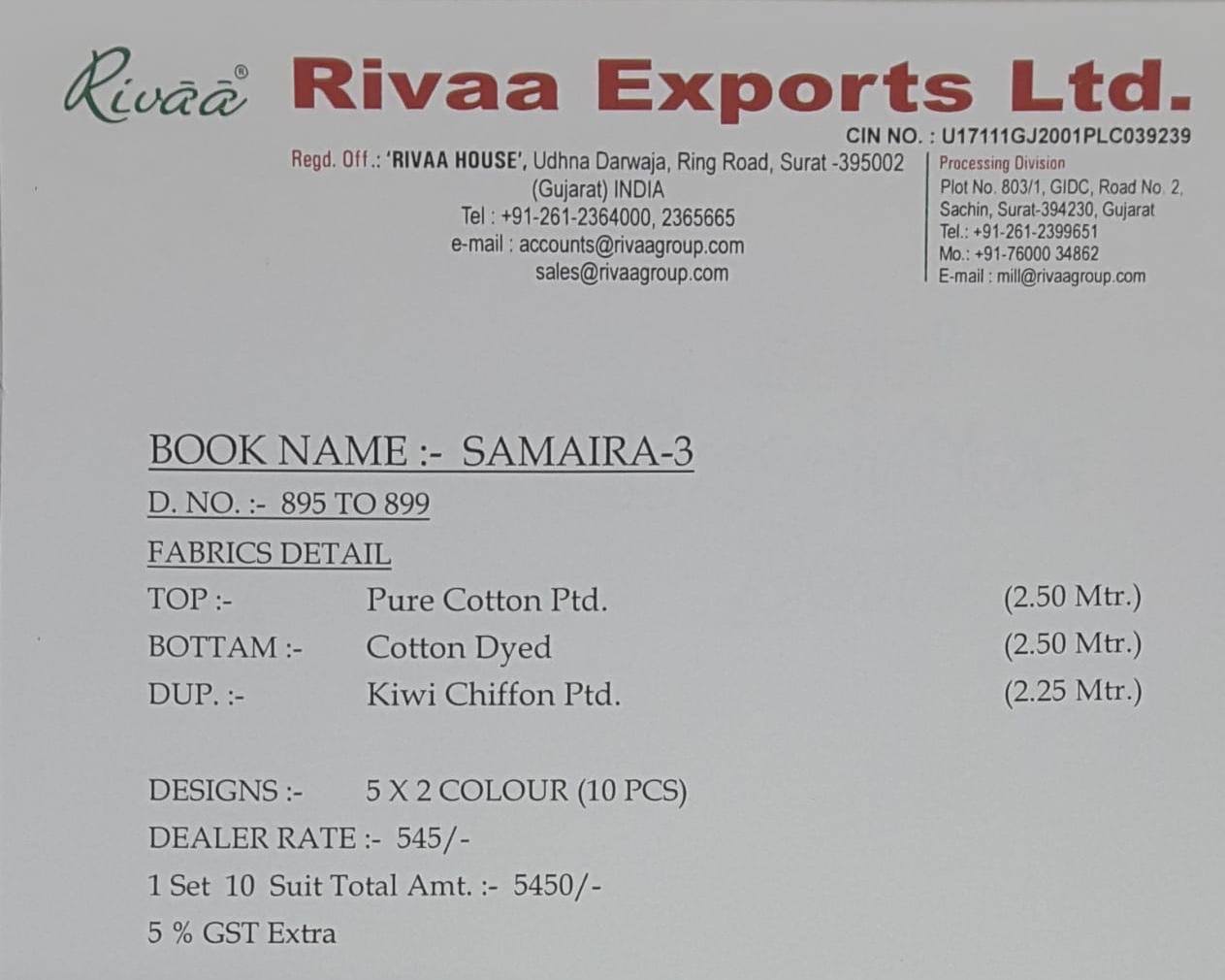 Buy Online Samaira 3 By Rivaa Exports Cotton Printed Suits Wholesale Supplier Gujarat 10 Pcs of Full Catalogue at Wholesale Price. Looking for Samaira 3 By Rivaa Exports Cotton Printed Suits Wholesale Supplier Gujarat Full Catalouge at Best Price? Buy Now Samaira 3 By Rivaa Exports Cotton Printed Suits Wholesale Supplier Gujarat at Wholesale Rate of Rs 5450 with Total 10 Pcs from authroized dealer and supplier of RIVAA Brand. Cost of Each piece is just only Rs 545 which is very low and affordable price to resale the product in your retail store ,This is Surat based Wholesale Supplier & Dealer of RIVAA Brand. Click on Brand name to Know more about RIVAA Brand's products.Call or Whatsapp on 9898838984 for booking or enquiry