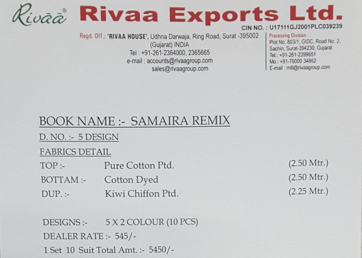 Buy Online Samaira Remix By Rivaa Cotton Printed Suits Wholesale Supplier And Dealer Gujarat 10 Pcs of Full Catalogue at Wholesale Price. Looking for Samaira Remix By Rivaa Cotton Printed Suits Wholesale Supplier And Dealer Gujarat Full Catalouge at Best Price? Buy Now Samaira Remix By Rivaa Cotton Printed Suits Wholesale Supplier And Dealer Gujarat at Wholesale Rate of Rs 5450 with Total 10 Pcs from authroized dealer and supplier of RIVAA Brand. Cost of Each piece is just only Rs 545 which is very low and affordable price to resale the product in your retail store ,This is Surat based Wholesale Supplier & Dealer of RIVAA Brand. Click on Brand name to Know more about RIVAA Brand's products.Call or Whatsapp on 9898838984 for booking or enquiry
