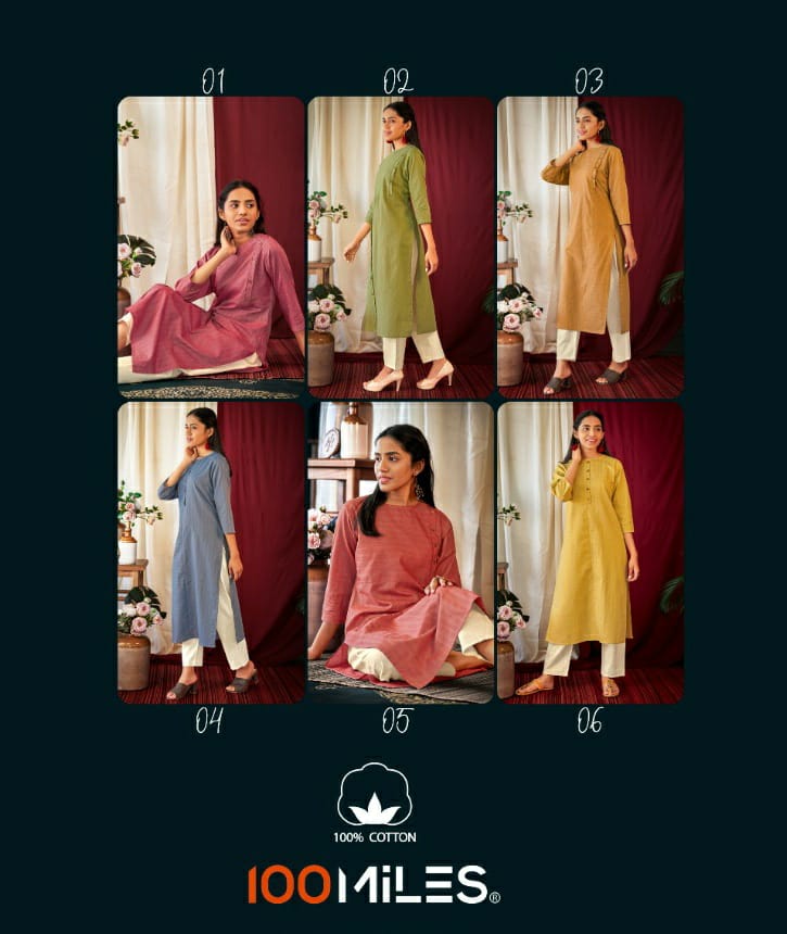 Buy Online Samara By 100miles Cotton Kurtis With Bottom Wholesale Dealer And Exporter India 6 Pcs of Full Catalogue at Wholesale Price. Looking for Samara By 100miles Cotton Kurtis With Bottom Wholesale Dealer And Exporter India Full Catalouge at Best Price? Buy Now Samara By 100miles Cotton Kurtis With Bottom Wholesale Dealer And Exporter India at Wholesale Rate of Rs 3570 with Total 6 Pcs from authroized dealer and supplier of 100 MILES Brand. Cost of Each piece is just only Rs 595 which is very low and affordable price to resale the product in your retail store ,This is Surat based Wholesale Supplier & Dealer of 100 MILES Brand. Click on Brand name to Know more about 100 MILES Brand's products.Call or Whatsapp on 9898838984 for booking or enquiry