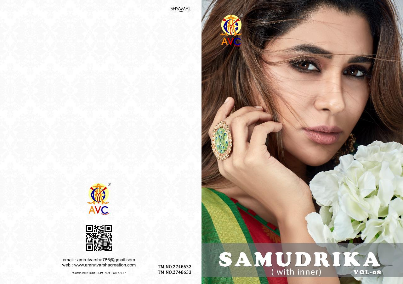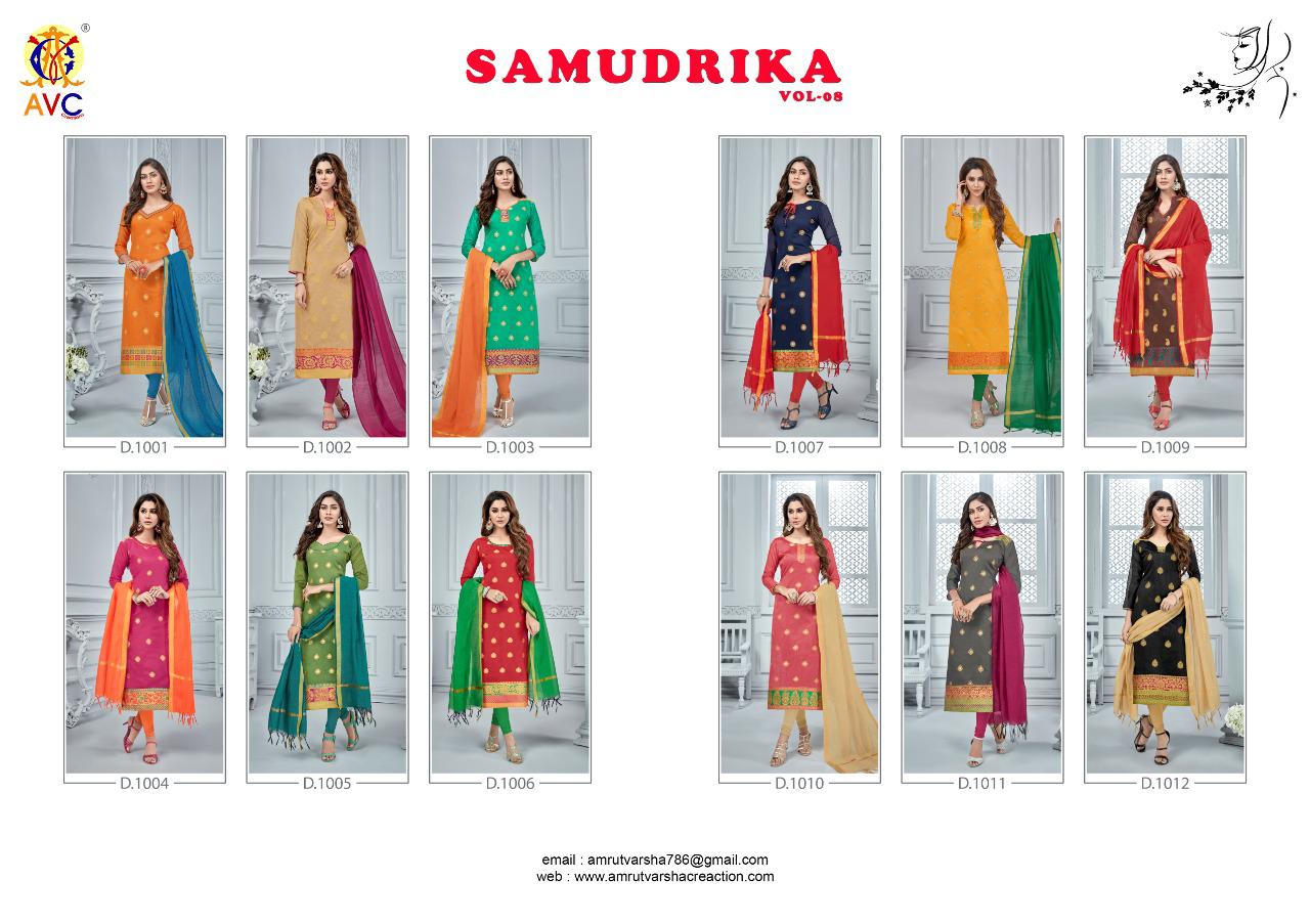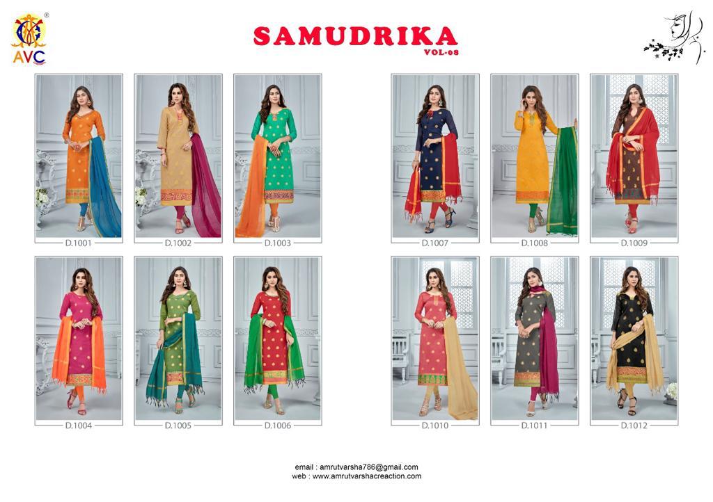 Buy Online Samudrika Vol 8 By Avc Banarasi Jaquard Suits Wholesale Supplier Gujarat 12 Pcs of Full Catalogue at Wholesale Price. Looking for Samudrika Vol 8 By Avc Banarasi Jaquard Suits Wholesale Supplier Gujarat Full Catalouge at Best Price? Buy Now Samudrika Vol 8 By Avc Banarasi Jaquard Suits Wholesale Supplier Gujarat at Wholesale Rate of Rs 4788 with Total 12 Pcs from authroized dealer and supplier of AVC Brand. Cost of Each piece is just only Rs 399 which is very low and affordable price to resale the product in your retail store ,This is Surat based Wholesale Supplier & Dealer of AVC Brand. Click on Brand name to Know more about AVC Brand's products.Call or Whatsapp on 9898838984 for booking or enquiry
