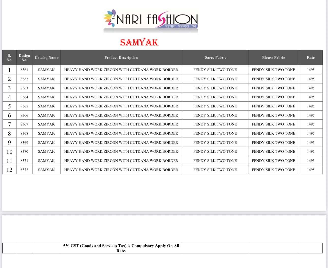 Buy Online SAMYAK by nari fashion saree collection manufacturer surat 12 Pcs of Full Catalogue at Wholesale Price. Looking for SAMYAK by nari fashion saree collection manufacturer surat Full Catalouge at Best Price? Buy Now SAMYAK by nari fashion saree collection manufacturer surat at Wholesale Rate of Rs 17940 with Total 12 Pcs from authroized dealer and supplier of UTSAV NARI Brand. Cost of Each piece is just only Rs 1495 which is very low and affordable price to resale the product in your retail store ,This is Surat based Wholesale Supplier & Dealer of UTSAV NARI Brand. Click on Brand name to Know more about UTSAV NARI Brand's products.Call or Whatsapp on 9898838984 for booking or enquiry