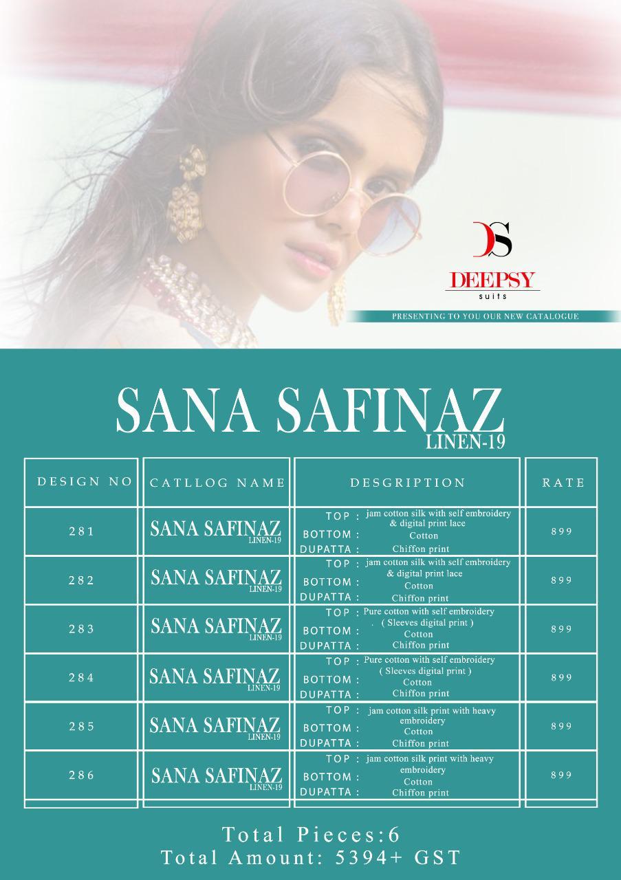Buy Online Sana Safinaz Linen 19 By Deepsy Series 281 Pakistani Suits Wholesale Supplier Gujarat 6 Pcs of Full Catalogue at Wholesale Price. Looking for Sana Safinaz Linen 19 By Deepsy Series 281 Pakistani Suits Wholesale Supplier Gujarat Full Catalouge at Best Price? Buy Now Sana Safinaz Linen 19 By Deepsy Series 281 Pakistani Suits Wholesale Supplier Gujarat at Wholesale Rate of Rs 5394 with Total 6 Pcs from authroized dealer and supplier of DEEPSY Brand. Cost of Each piece is just only Rs 899 which is very low and affordable price to resale the product in your retail store ,This is Surat based Wholesale Supplier & Dealer of DEEPSY Brand. Click on Brand name to Know more about DEEPSY Brand's products.Call or Whatsapp on 9898838984 for booking or enquiry