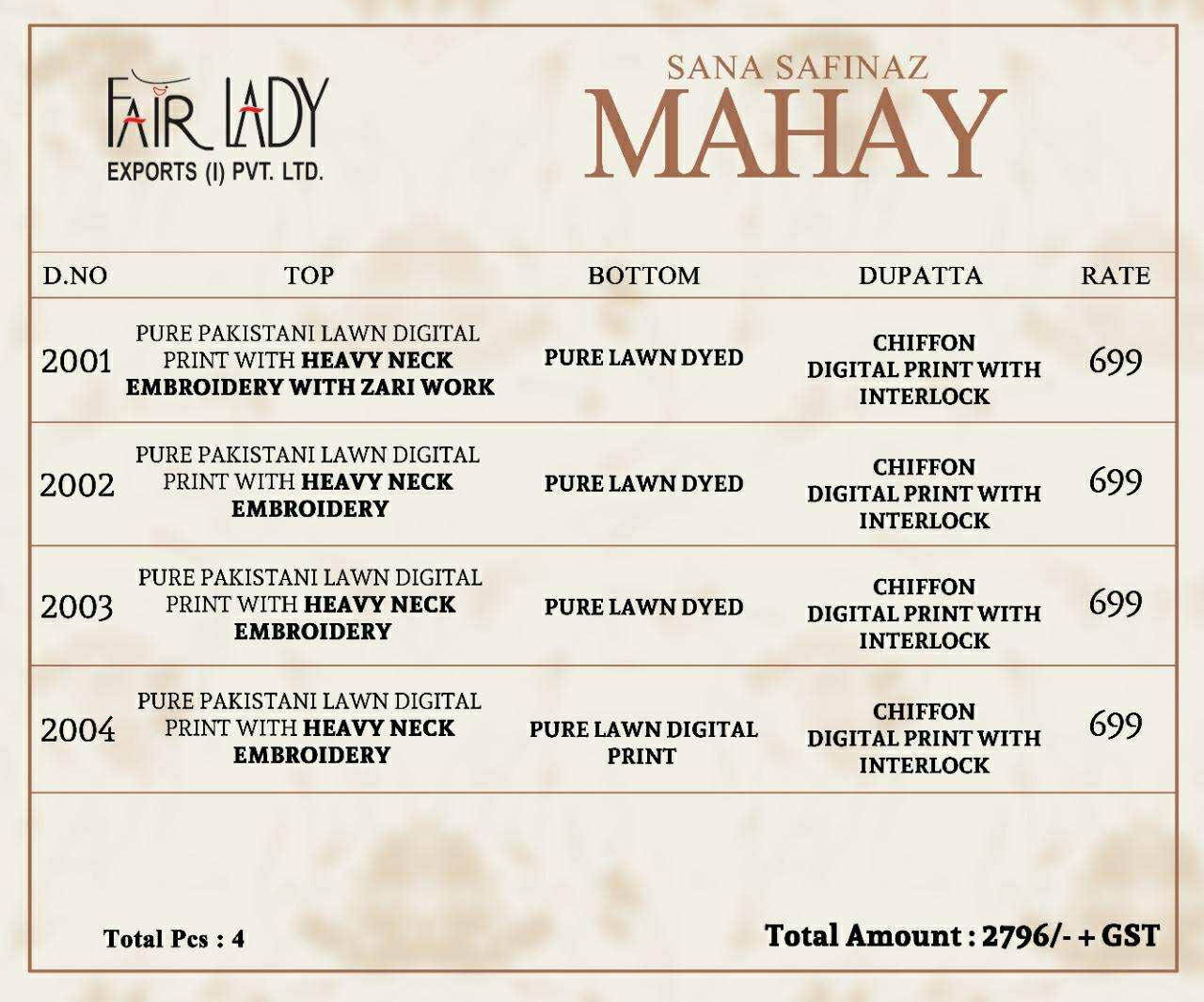 Buy Online Sana Safinaz Mahay By Fair Lady Jam Satin Print With Heavy Embroidery 4 Pcs of Full Catalogue at Wholesale Price. Looking for Sana Safinaz Mahay By Fair Lady Jam Satin Print With Heavy Embroidery Full Catalouge at Best Price? Buy Now Sana Safinaz Mahay By Fair Lady Jam Satin Print With Heavy Embroidery at Wholesale Rate of Rs 2796 with Total 4 Pcs from authroized dealer and supplier of Brand. Cost of Each piece is just only Rs 699 which is very low and affordable price to resale the product in your retail store ,This is Surat based Wholesale Supplier & Dealer of Brand. Click on Brand name to Know more about Brand's products.Call or Whatsapp on 9898838984 for booking or enquiry