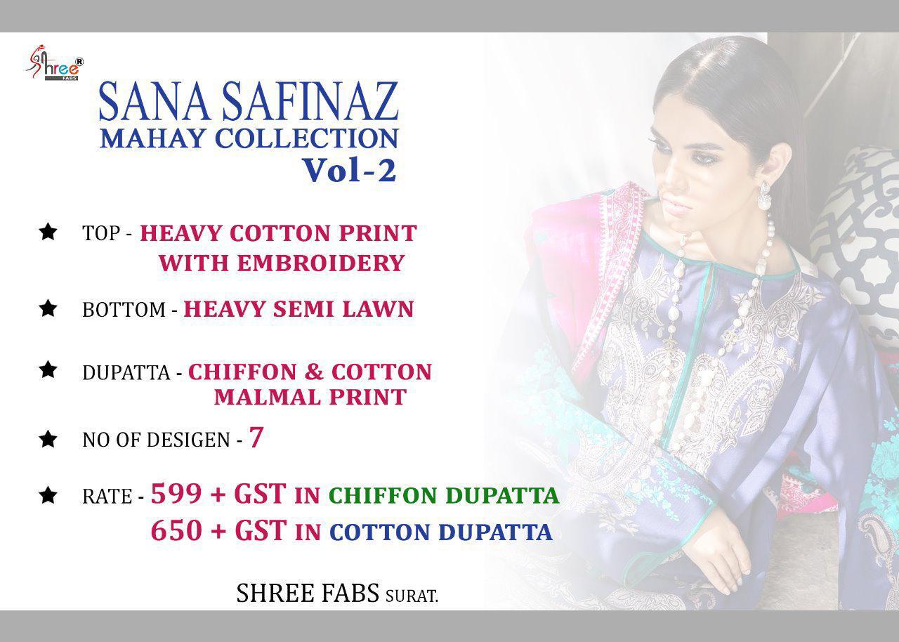 Buy Online Sana Safinaz Mahay Collection Vol 2 By Shree Fab Cotton Printed Pakistani Suits Wholesale Supplier Gujarat 7 Pcs of Full Catalogue at Wholesale Price. Looking for Sana Safinaz Mahay Collection Vol 2 By Shree Fab Cotton Printed Pakistani Suits Wholesale Supplier Gujarat Full Catalouge at Best Price? Buy Now Sana Safinaz Mahay Collection Vol 2 By Shree Fab Cotton Printed Pakistani Suits Wholesale Supplier Gujarat at Wholesale Rate of Rs 4193 with Total 7 Pcs from authroized dealer and supplier of SHREE FABS Brand. Cost of Each piece is just only Rs 599 which is very low and affordable price to resale the product in your retail store ,This is Surat based Wholesale Supplier & Dealer of SHREE FABS Brand. Click on Brand name to Know more about SHREE FABS Brand's products.Call or Whatsapp on 9898838984 for booking or enquiry