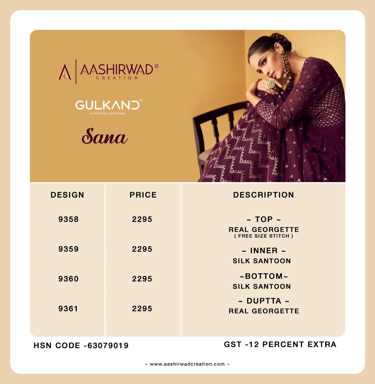 Buy Online Sana Series 9358 To 9361 By Aashirwad Creation Designer Readymade Collection Wholesaler Supplier From Surat 4 Pcs of Full Catalogue at Wholesale Price. Looking for Sana Series 9358 To 9361 By Aashirwad Creation Designer Readymade Collection Wholesaler Supplier From Surat Full Catalouge at Best Price? Buy Now Sana Series 9358 To 9361 By Aashirwad Creation Designer Readymade Collection Wholesaler Supplier From Surat at Wholesale Rate of Rs 9180 with Total 4 Pcs from authroized dealer and supplier of AASHIRWAD Brand. Cost of Each piece is just only Rs 2295 which is very low and affordable price to resale the product in your retail store ,This is Surat based Wholesale Supplier & Dealer of AASHIRWAD Brand. Click on Brand name to Know more about AASHIRWAD Brand's products.Call or Whatsapp on 9898838984 for booking or enquiry