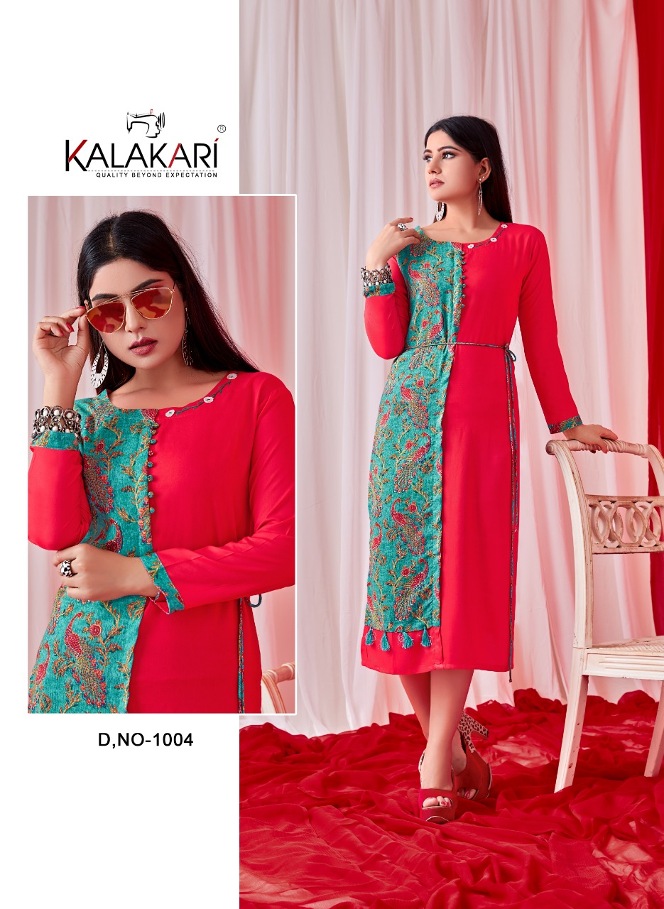 Buy Online Sanchi Vol 4 By Kalakari Nx 1001 Series Fancy Reyon Kurti Catlog Wholesale Dealer Surat 6 Pcs of Full Catalogue at Wholesale Price. Looking for Sanchi Vol 4 By Kalakari Nx 1001 Series Fancy Reyon Kurti Catlog Wholesale Dealer Surat Full Catalouge at Best Price? Buy Now Sanchi Vol 4 By Kalakari Nx 1001 Series Fancy Reyon Kurti Catlog Wholesale Dealer Surat at Wholesale Rate of Rs 2694 with Total 6 Pcs from authroized dealer and supplier of KALAKARI NX Brand. Cost of Each piece is just only Rs 449 which is very low and affordable price to resale the product in your retail store ,This is Surat based Wholesale Supplier & Dealer of KALAKARI NX Brand. Click on Brand name to Know more about KALAKARI NX Brand's products.Call or Whatsapp on 9898838984 for booking or enquiry