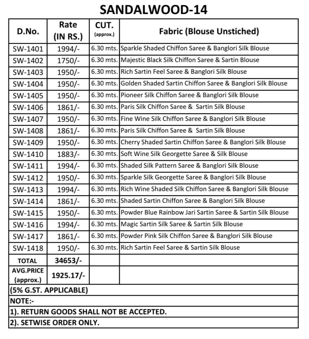 Buy Online SANDAL WOOD 14 SERIES 1401 TO 1418 by TFH PARTY WEAR saree SANDAL WOOD 14 SERIES 1401 TO 1418 by TFH PARTY WEAR saree creation manufacturer surat creation manufacturer surat 18 Pcs of Full Catalogue at Wholesale Price. Looking for SANDAL WOOD 14 SERIES 1401 TO 1418 by TFH PARTY WEAR saree SANDAL WOOD 14 SERIES 1401 TO 1418 by TFH PARTY WEAR saree creation manufacturer surat creation manufacturer surat Full Catalouge at Best Price? Buy Now SANDAL WOOD 14 SERIES 1401 TO 1418 by TFH PARTY WEAR saree SANDAL WOOD 14 SERIES 1401 TO 1418 by TFH PARTY WEAR saree creation manufacturer surat creation manufacturer surat at Wholesale Rate of Rs 34650 with Total 18 Pcs from authroized dealer and supplier of TFH Brand. Cost of Each piece is just only Rs 1925.17 which is very low and affordable price to resale the product in your retail store ,This is Surat based Wholesale Supplier & Dealer of TFH Brand. Click on Brand name to Know more about TFH Brand's products.Call or Whatsapp on 9898838984 for booking or enquiry