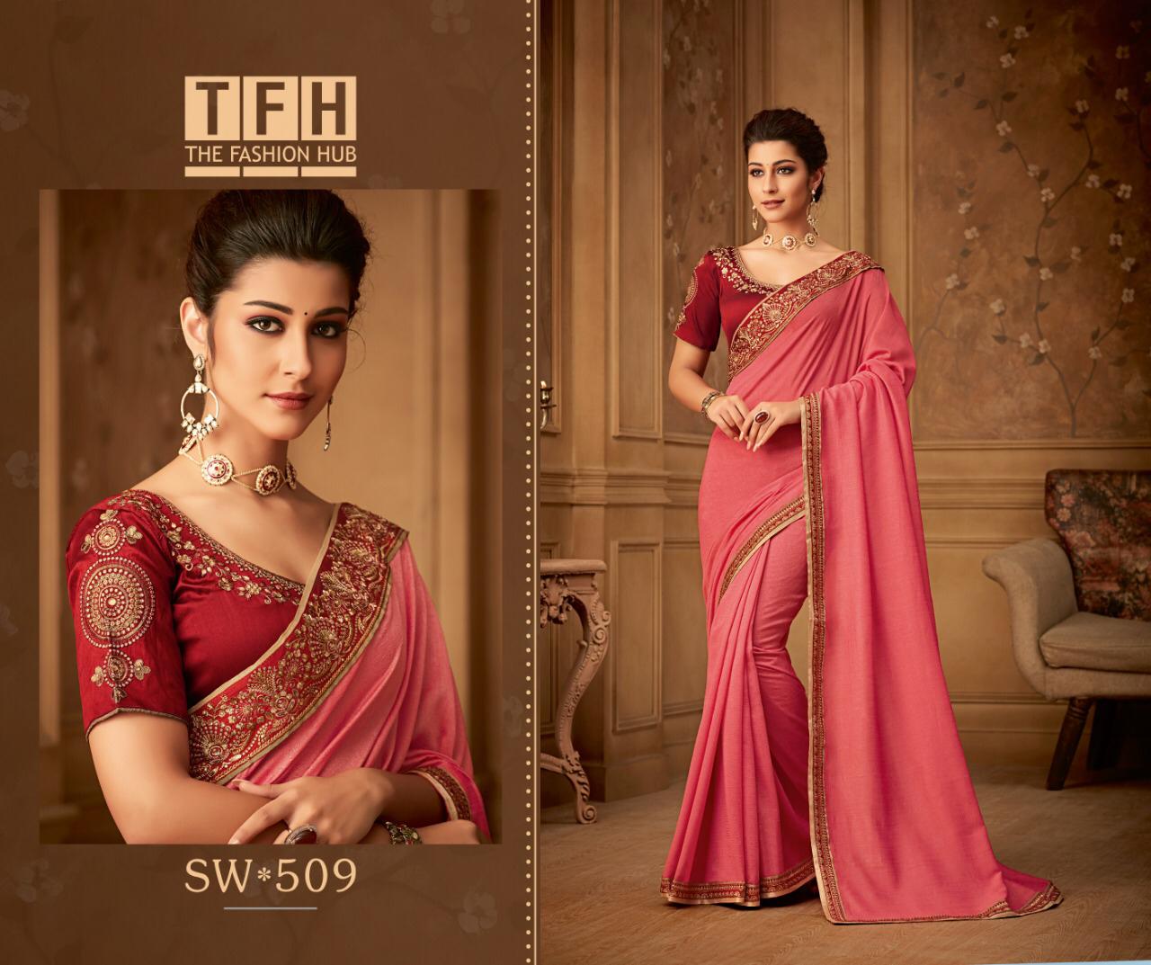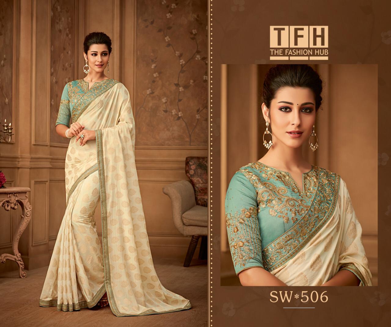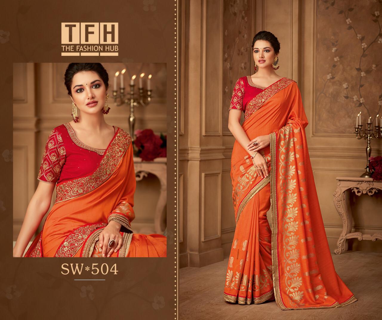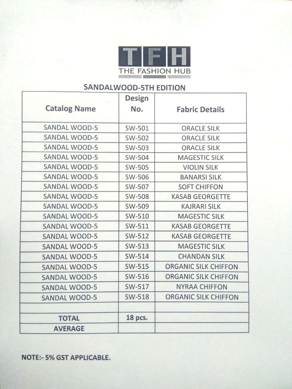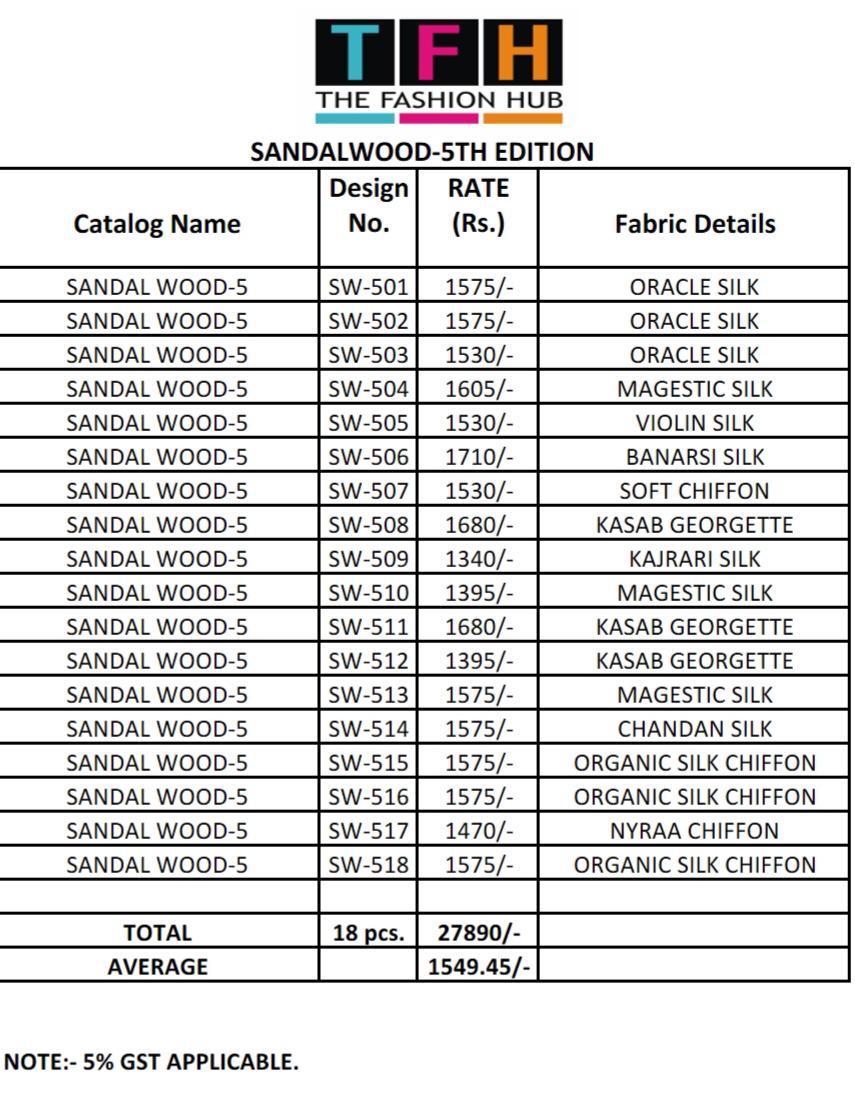 Brand - TFH . Type - Saree. Catlog name - SANDAL WOOD -5. Set & Loose. Singel extra 100 on company price list GST 5 Percent Extra. Series -SW-501 To SW-518. Delivery 4-5 days |