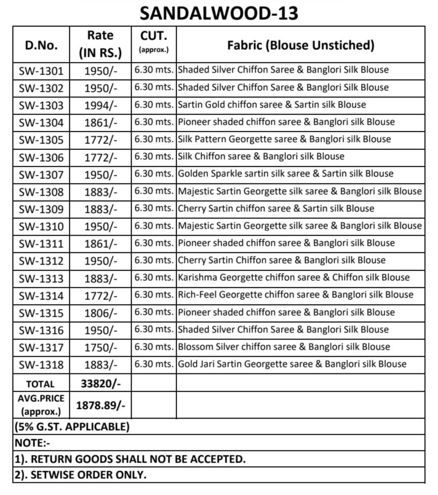 TFH (THE FASHION HUB) Presents *"SANDALWOOD"* 1). Catalog - Sandalwood (13). 2). Pcs.- 18. price list attached GST 5% EXTRA SINGLE AVAILABLE 100+single |