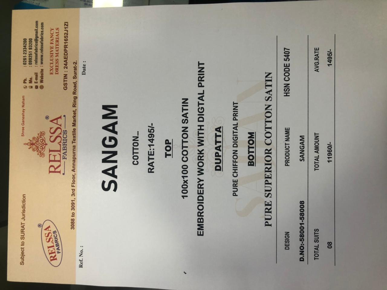 Buy Online Sangam By Relisha Manufacturer Traders Surat 8 Pcs of Full Catalogue at Wholesale Price. Looking for Sangam By Relisha Manufacturer Traders Surat Full Catalouge at Best Price? Buy Now Sangam By Relisha Manufacturer Traders Surat at Wholesale Rate of Rs 11960 with Total 8 Pcs from authroized dealer and supplier of Brand. Cost of Each piece is just only Rs 1495 which is very low and affordable price to resale the product in your retail store ,This is Surat based Wholesale Supplier & Dealer of Brand. Click on Brand name to Know more about Brand's products.Call or Whatsapp on 9898838984 for booking or enquiry