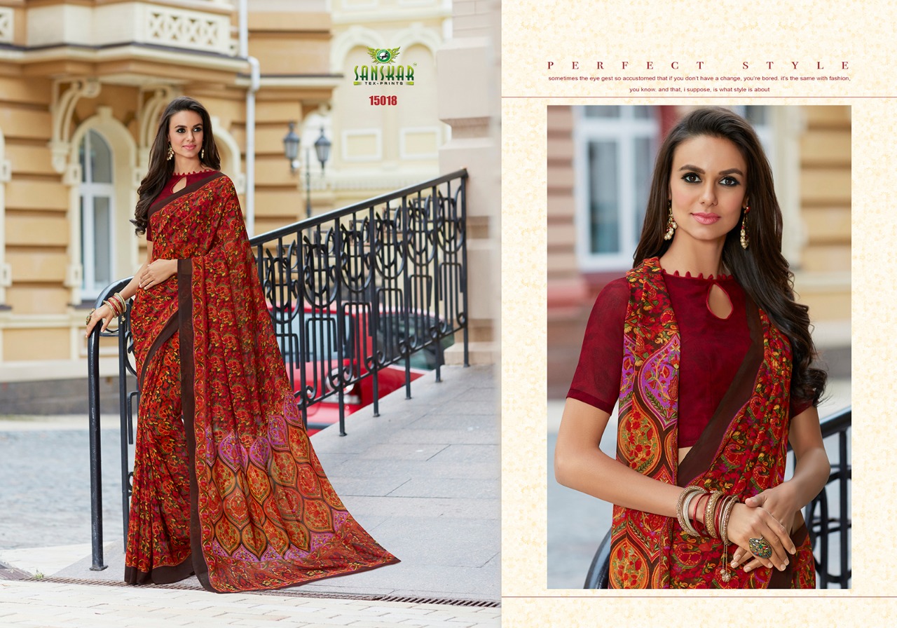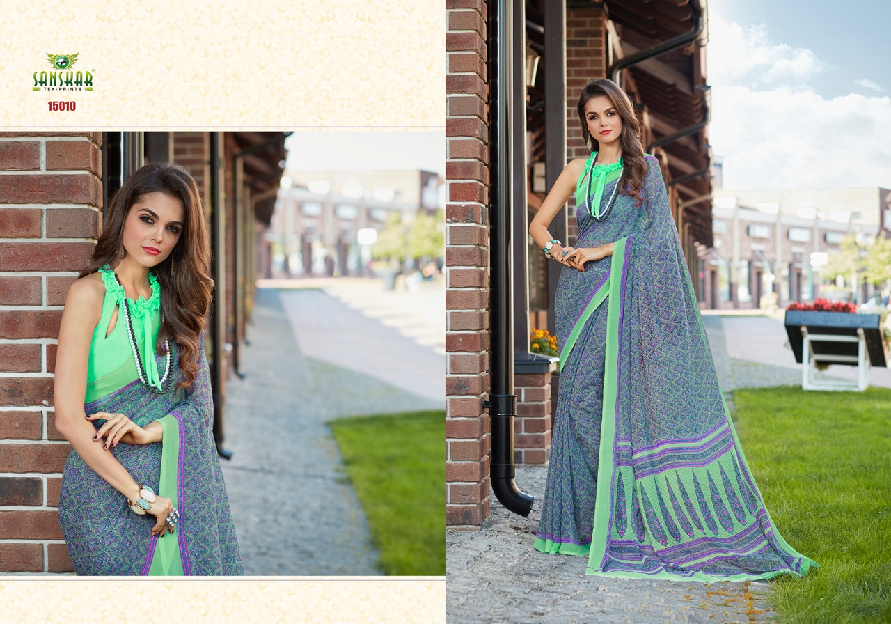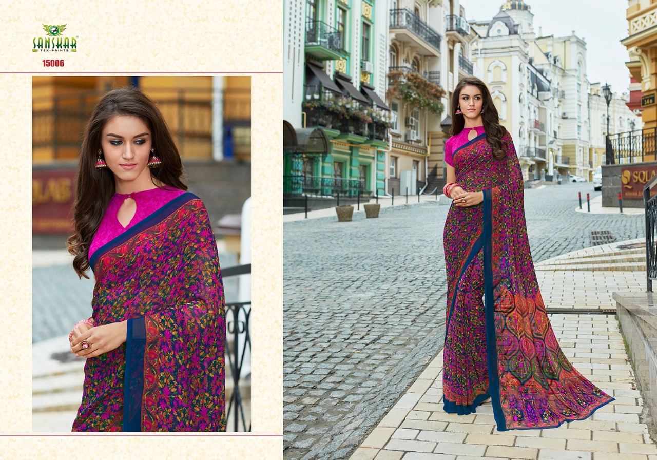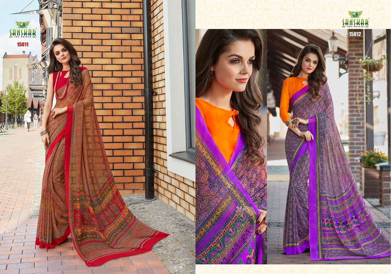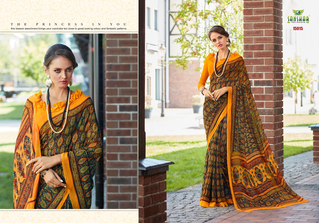 Buy Online Sanskar Ashna New Series 15001 To 150018 Georgette Printed Sarees Wholesale Supplier And Dealer Nityanx Surat 18 Pcs of Full Catalogue at Wholesale Price. Looking for Sanskar Ashna New Series 15001 To 150018 Georgette Printed Sarees Wholesale Supplier And Dealer Nityanx Surat Full Catalouge at Best Price? Buy Now Sanskar Ashna New Series 15001 To 150018 Georgette Printed Sarees Wholesale Supplier And Dealer Nityanx Surat at Wholesale Rate of Rs 7830 with Total 18 Pcs from authroized dealer and supplier of SANSKAR SAREES Brand. Cost of Each piece is just only Rs 435 which is very low and affordable price to resale the product in your retail store ,This is Surat based Wholesale Supplier & Dealer of SANSKAR SAREES Brand. Click on Brand name to Know more about SANSKAR SAREES Brand's products.Call or Whatsapp on 9898838984 for booking or enquiry