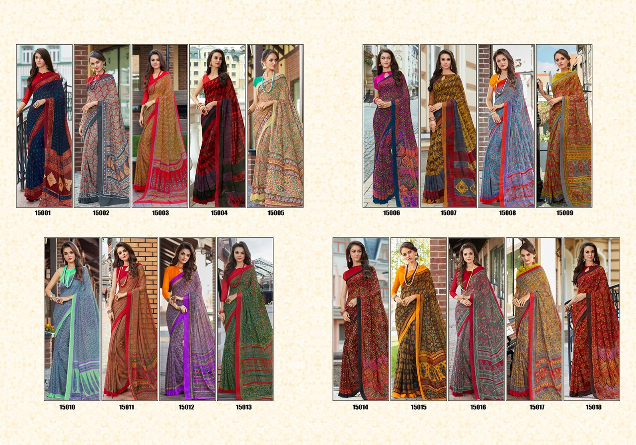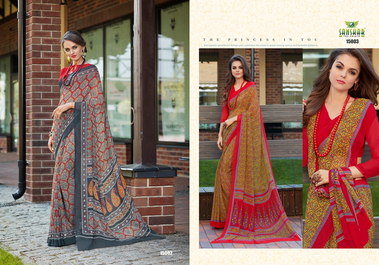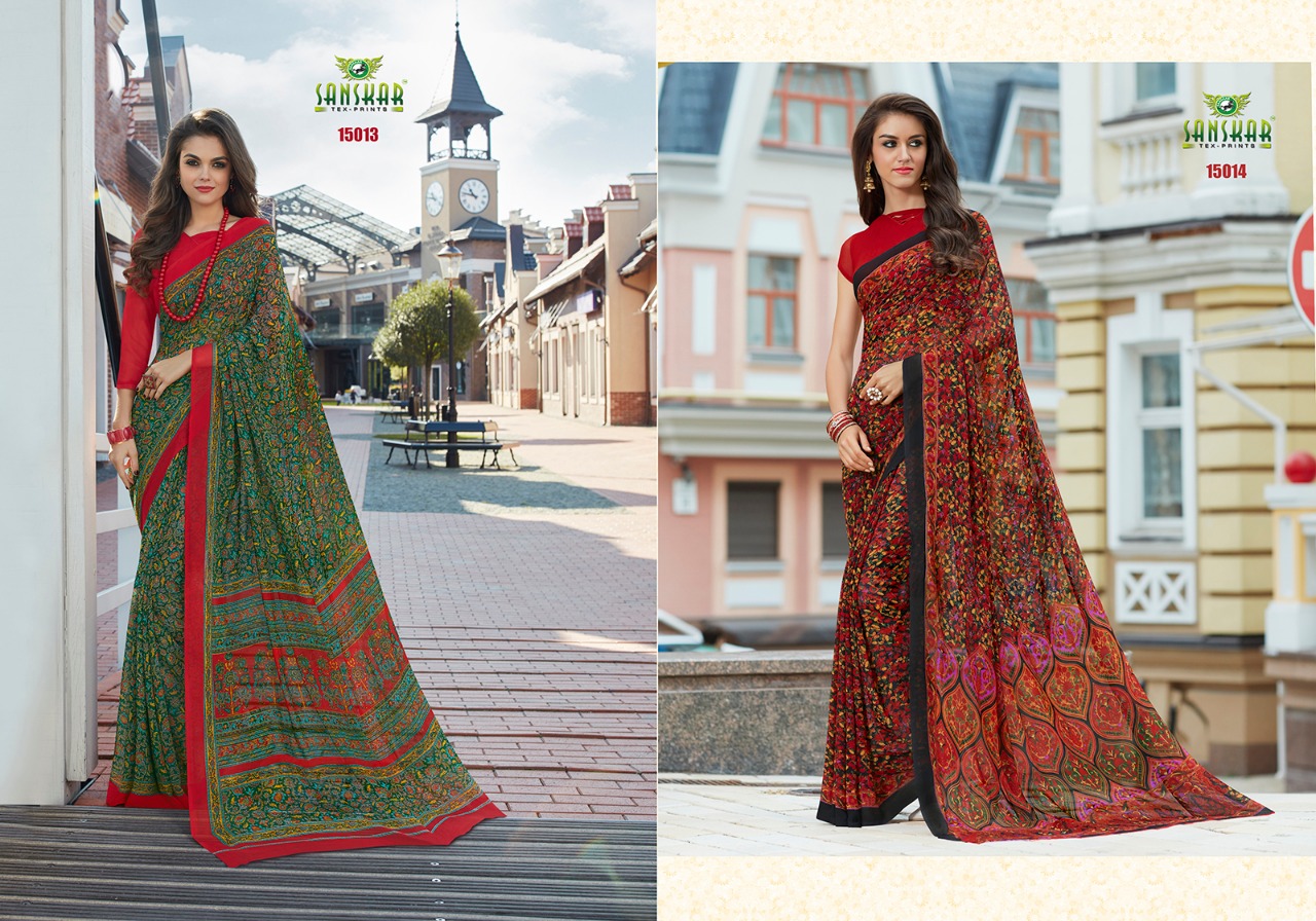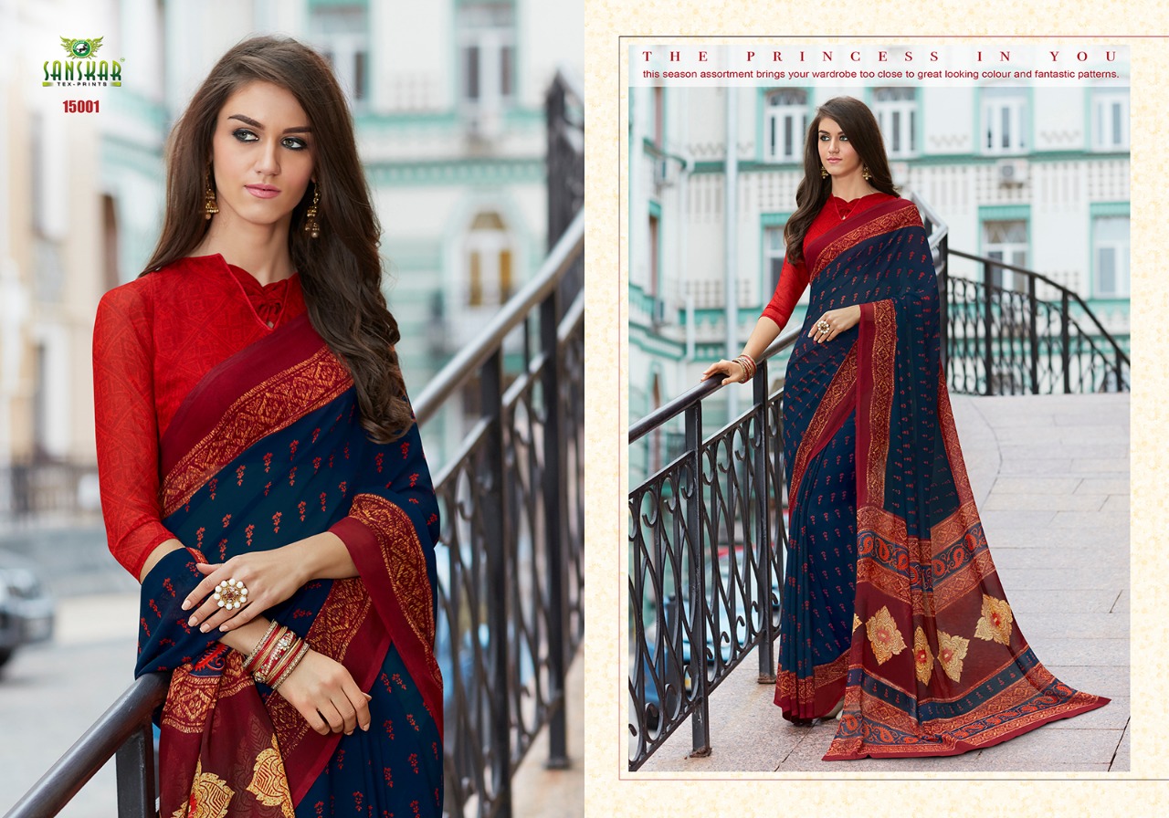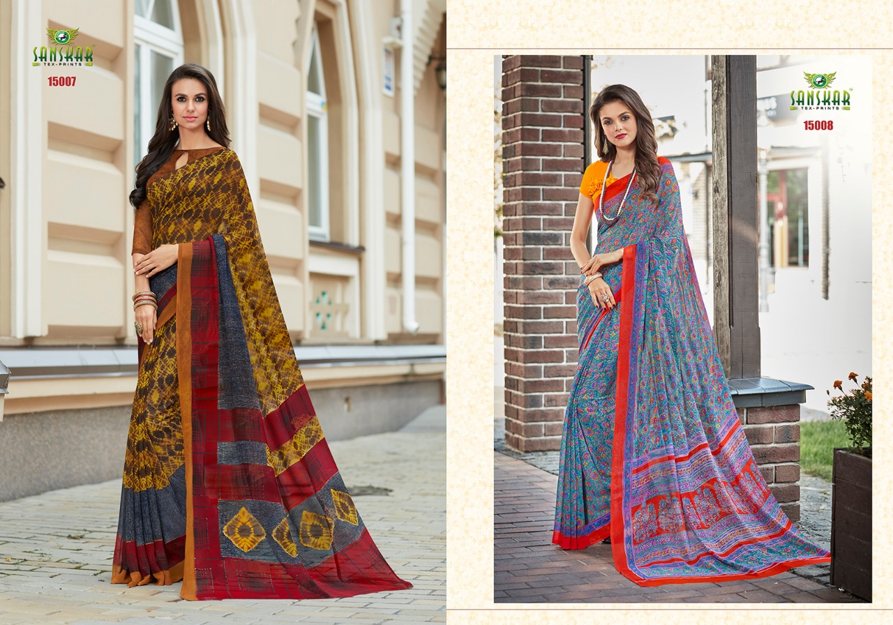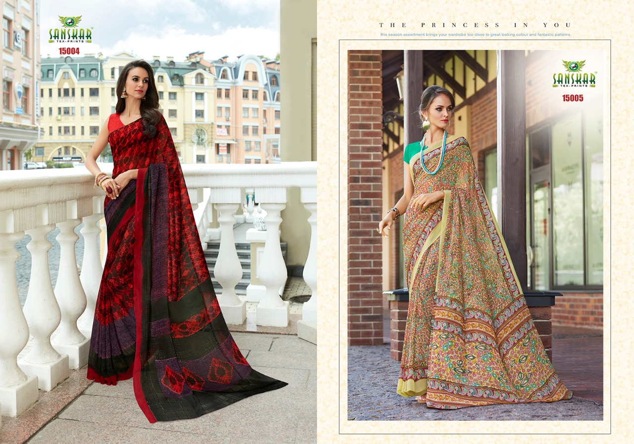 Buy Online Sanskar Ashna New Series 15001 To 150018 Georgette Printed Sarees Wholesale Supplier And Dealer Nityanx Surat 18 Pcs of Full Catalogue at Wholesale Price. Looking for Sanskar Ashna New Series 15001 To 150018 Georgette Printed Sarees Wholesale Supplier And Dealer Nityanx Surat Full Catalouge at Best Price? Buy Now Sanskar Ashna New Series 15001 To 150018 Georgette Printed Sarees Wholesale Supplier And Dealer Nityanx Surat at Wholesale Rate of Rs 7830 with Total 18 Pcs from authroized dealer and supplier of SANSKAR SAREES Brand. Cost of Each piece is just only Rs 435 which is very low and affordable price to resale the product in your retail store ,This is Surat based Wholesale Supplier & Dealer of SANSKAR SAREES Brand. Click on Brand name to Know more about SANSKAR SAREES Brand's products.Call or Whatsapp on 9898838984 for booking or enquiry