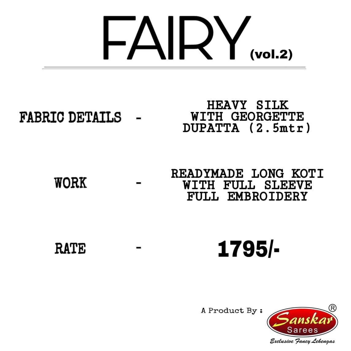 Brand - Sanskar styel . Catlog name - Fairy Vol -2: Set to set . GST 12 Percent Extra. Delivery 2 days . |