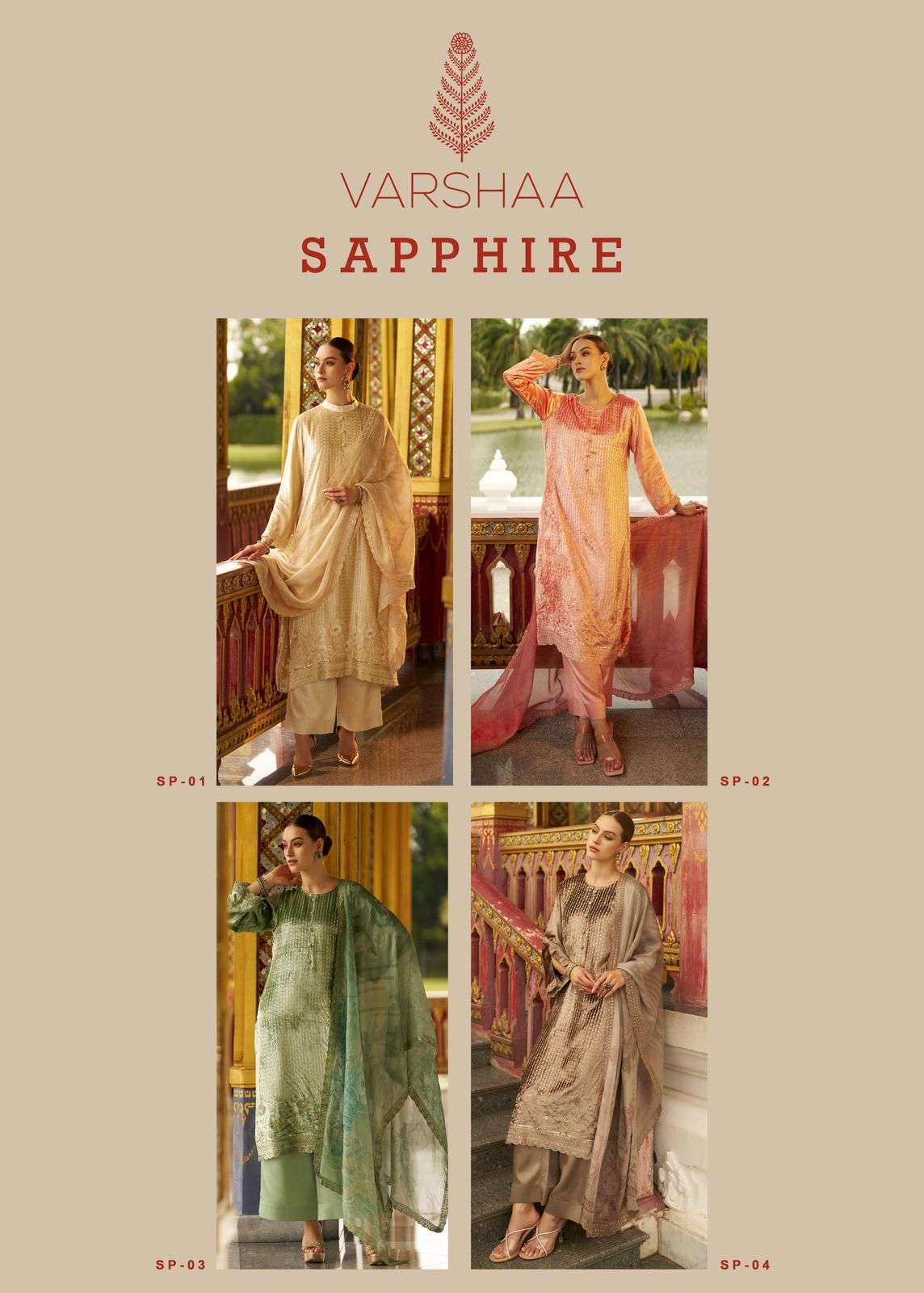 Buy Online SAPPHIRE SERIES 01 TO 04 BY VARSHAA DESIGNER VELVET SUITS 4 Pcs of Full Catalogue at Wholesale Price. Looking for SAPPHIRE SERIES 01 TO 04 BY VARSHAA DESIGNER VELVET SUITS Full Catalouge at Best Price? Buy Now SAPPHIRE SERIES 01 TO 04 BY VARSHAA DESIGNER VELVET SUITS at Wholesale Rate of Rs 15520 with Total 4 Pcs from authroized dealer and supplier of Varsha Brand. Cost of Each piece is just only Rs 3880 which is very low and affordable price to resale the product in your retail store ,This is Surat based Wholesale Supplier & Dealer of Varsha Brand. Click on Brand name to Know more about Varsha Brand's products.Call or Whatsapp on 9898838984 for booking or enquiry