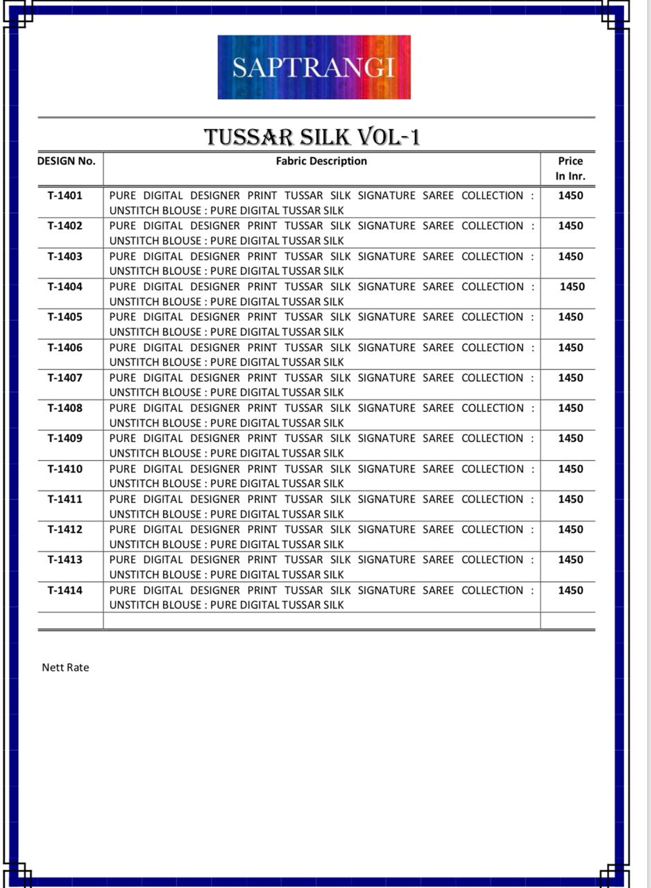 Buy Online Saptrangi Tussar Silk Vol 1 1401 Series Silk Printed Saree Catlog Wholesale Dealer And Supplier Surat 14 Pcs of Full Catalogue at Wholesale Price. Looking for Saptrangi Tussar Silk Vol 1 1401 Series Silk Printed Saree Catlog Wholesale Dealer And Supplier Surat Full Catalouge at Best Price? Buy Now Saptrangi Tussar Silk Vol 1 1401 Series Silk Printed Saree Catlog Wholesale Dealer And Supplier Surat at Wholesale Rate of Rs 20300 with Total 14 Pcs from authroized dealer and supplier of SAPTARANGI Brand. Cost of Each piece is just only Rs 1450 which is very low and affordable price to resale the product in your retail store ,This is Surat based Wholesale Supplier & Dealer of SAPTARANGI Brand. Click on Brand name to Know more about SAPTARANGI Brand's products.Call or Whatsapp on 9898838984 for booking or enquiry