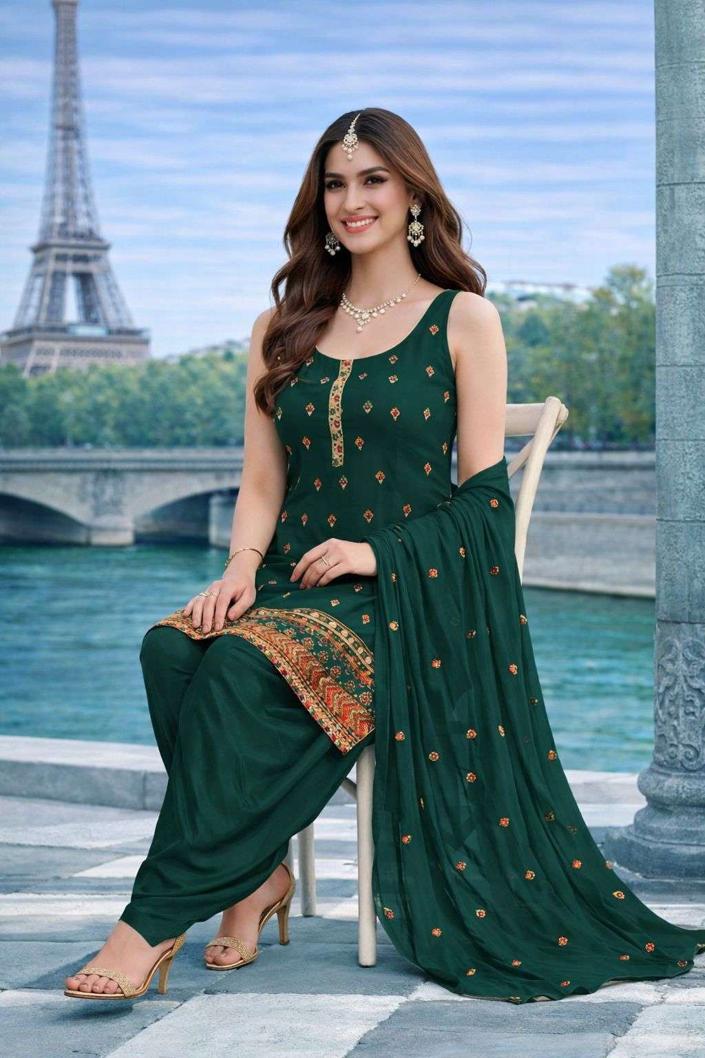 FABRIC - REAL PREMIUM GEORGETTE ( HEAVY EMBROIDERED WORK TOP WITH SANTOON DHOTI AND CHIFFON DUPATTA )