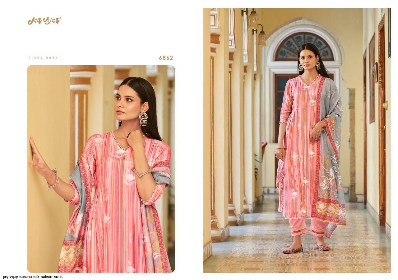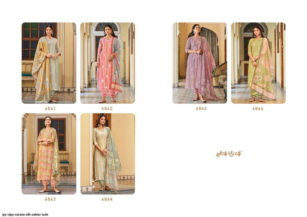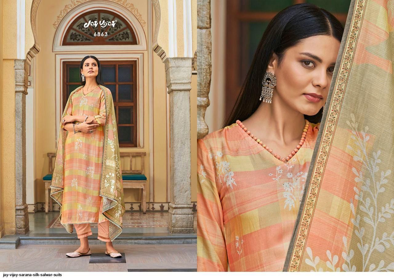 Buy Online Sarana By Jay Vijay Pure Silk Digital Prints Suit 6 Pcs of Full Catalogue at Wholesale Price. Looking for Sarana By Jay Vijay Pure Silk Digital Prints Suit Full Catalouge at Best Price? Buy Now Sarana By Jay Vijay Pure Silk Digital Prints Suit at Wholesale Rate of Rs 10050 with Total 6 Pcs from authroized dealer and supplier of JAY VIJAY Brand. Cost of Each piece is just only Rs 1675 which is very low and affordable price to resale the product in your retail store ,This is Surat based Wholesale Supplier & Dealer of JAY VIJAY Brand. Click on Brand name to Know more about JAY VIJAY Brand's products.Call or Whatsapp on 9898838984 for booking or enquiry