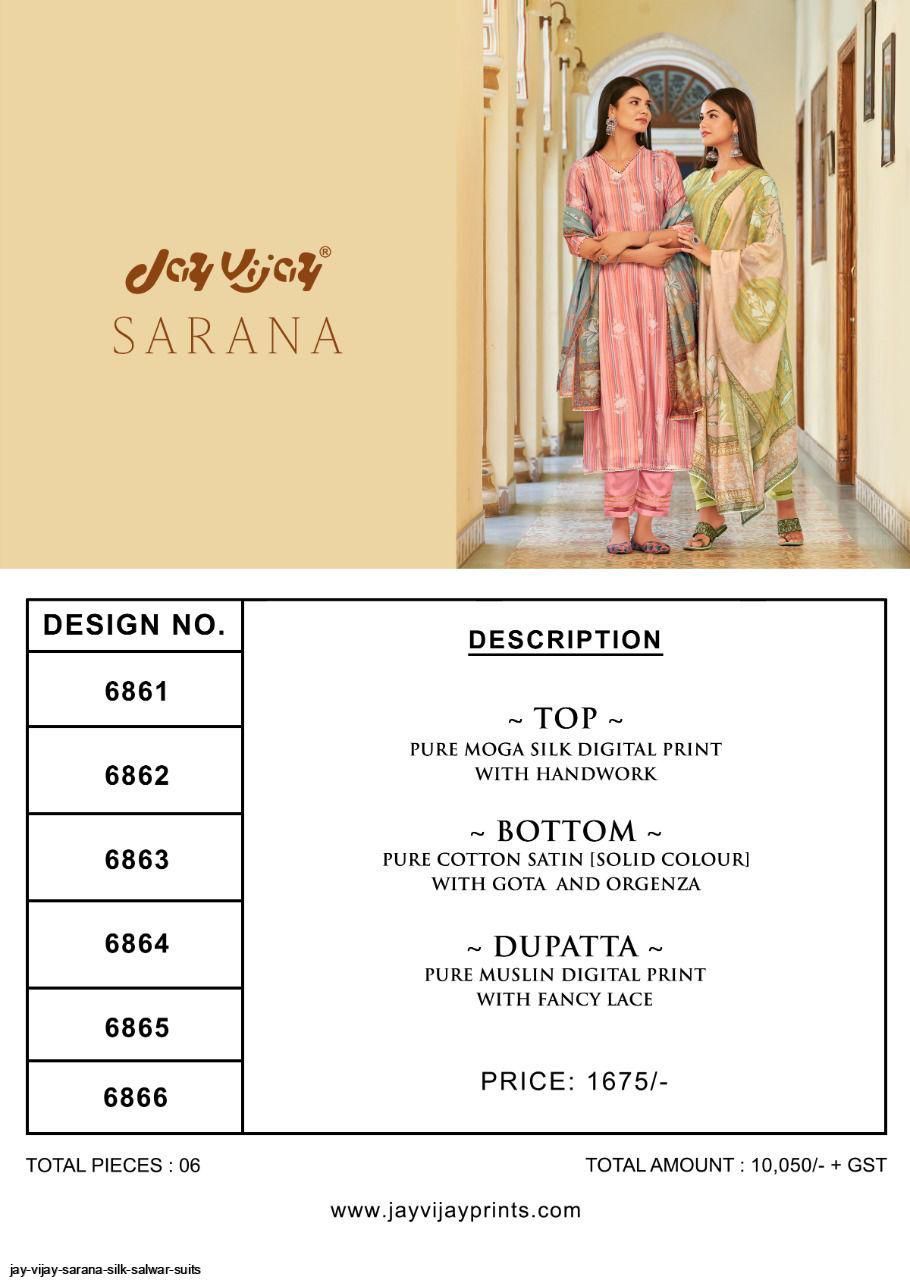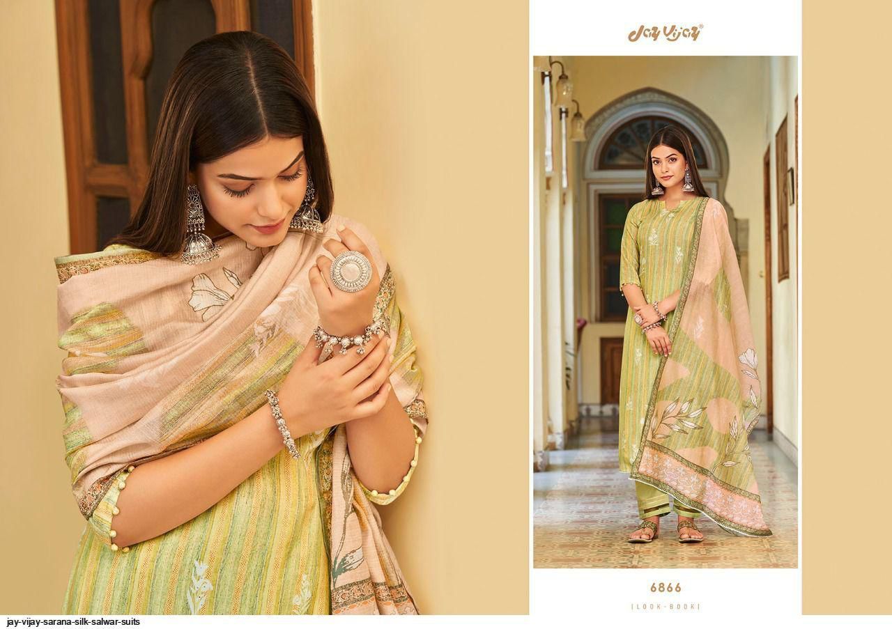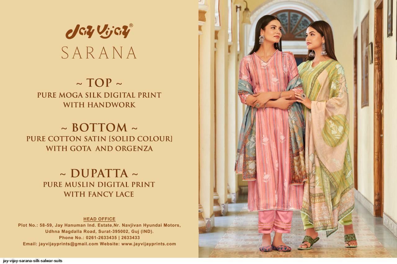 Buy Online Sarana By Jay Vijay Pure Silk Digital Prints Suit 6 Pcs of Full Catalogue at Wholesale Price. Looking for Sarana By Jay Vijay Pure Silk Digital Prints Suit Full Catalouge at Best Price? Buy Now Sarana By Jay Vijay Pure Silk Digital Prints Suit at Wholesale Rate of Rs 10050 with Total 6 Pcs from authroized dealer and supplier of JAY VIJAY Brand. Cost of Each piece is just only Rs 1675 which is very low and affordable price to resale the product in your retail store ,This is Surat based Wholesale Supplier & Dealer of JAY VIJAY Brand. Click on Brand name to Know more about JAY VIJAY Brand's products.Call or Whatsapp on 9898838984 for booking or enquiry