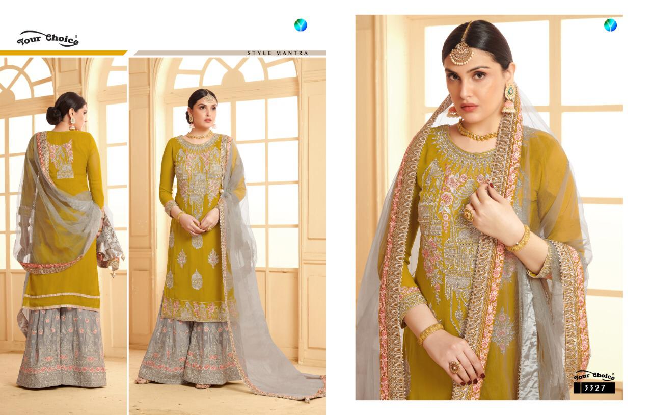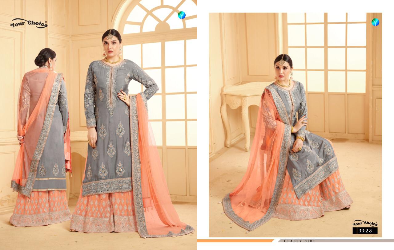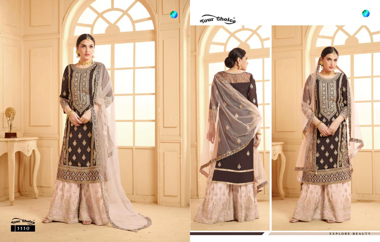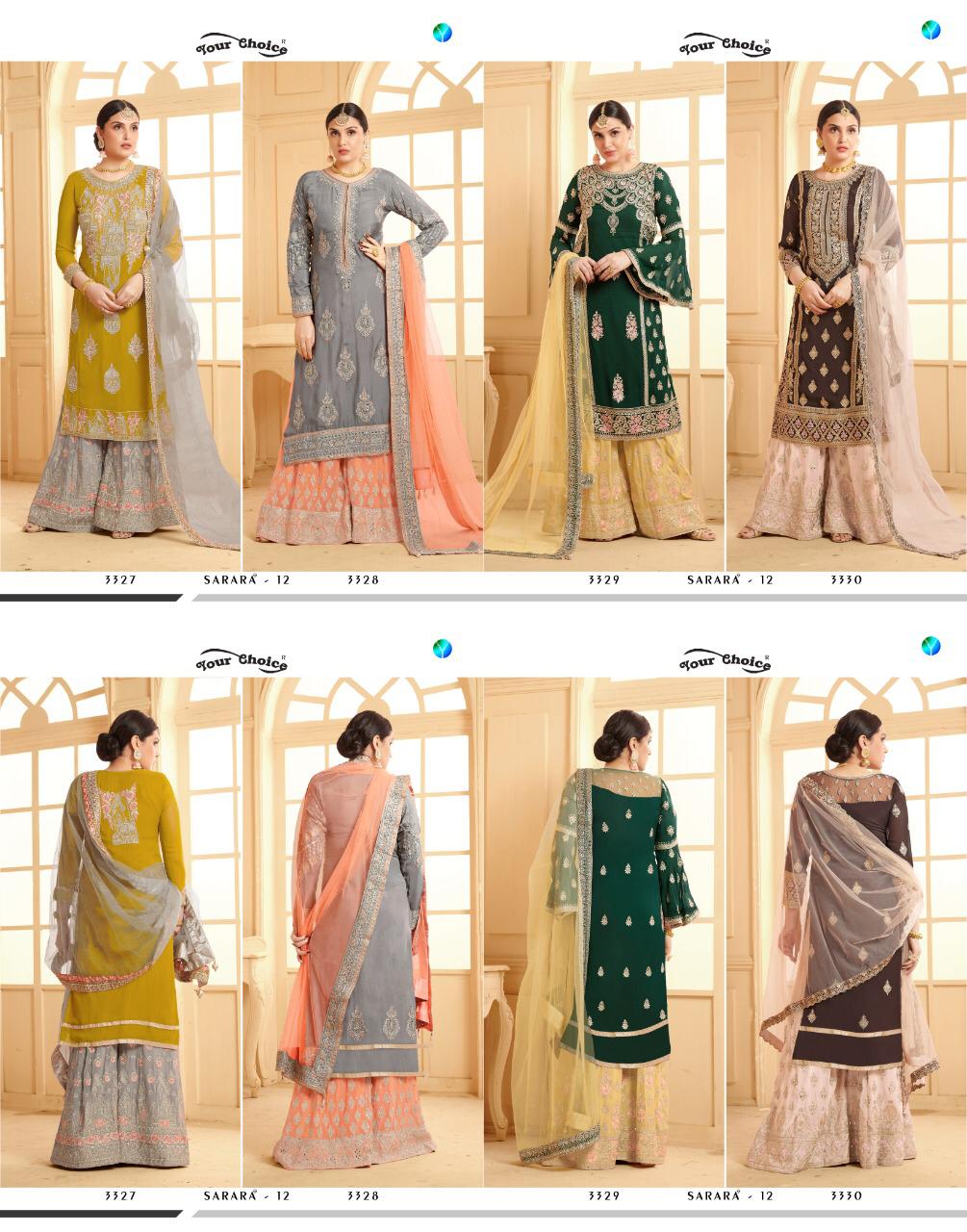 Buy Online Sarara 12 By Your Choice Series 3327 To 3330 Designer Party Wear Suits Wholesale Supplier Gujarat 4 Pcs of Full Catalogue at Wholesale Price. Looking for Sarara 12 By Your Choice Series 3327 To 3330 Designer Party Wear Suits Wholesale Supplier Gujarat Full Catalouge at Best Price? Buy Now Sarara 12 By Your Choice Series 3327 To 3330 Designer Party Wear Suits Wholesale Supplier Gujarat at Wholesale Rate of Rs 7980 with Total 4 Pcs from authroized dealer and supplier of YOUR CHOICE Brand. Cost of Each piece is just only Rs 1995 which is very low and affordable price to resale the product in your retail store ,This is Surat based Wholesale Supplier & Dealer of YOUR CHOICE Brand. Click on Brand name to Know more about YOUR CHOICE Brand's products.Call or Whatsapp on 9898838984 for booking or enquiry