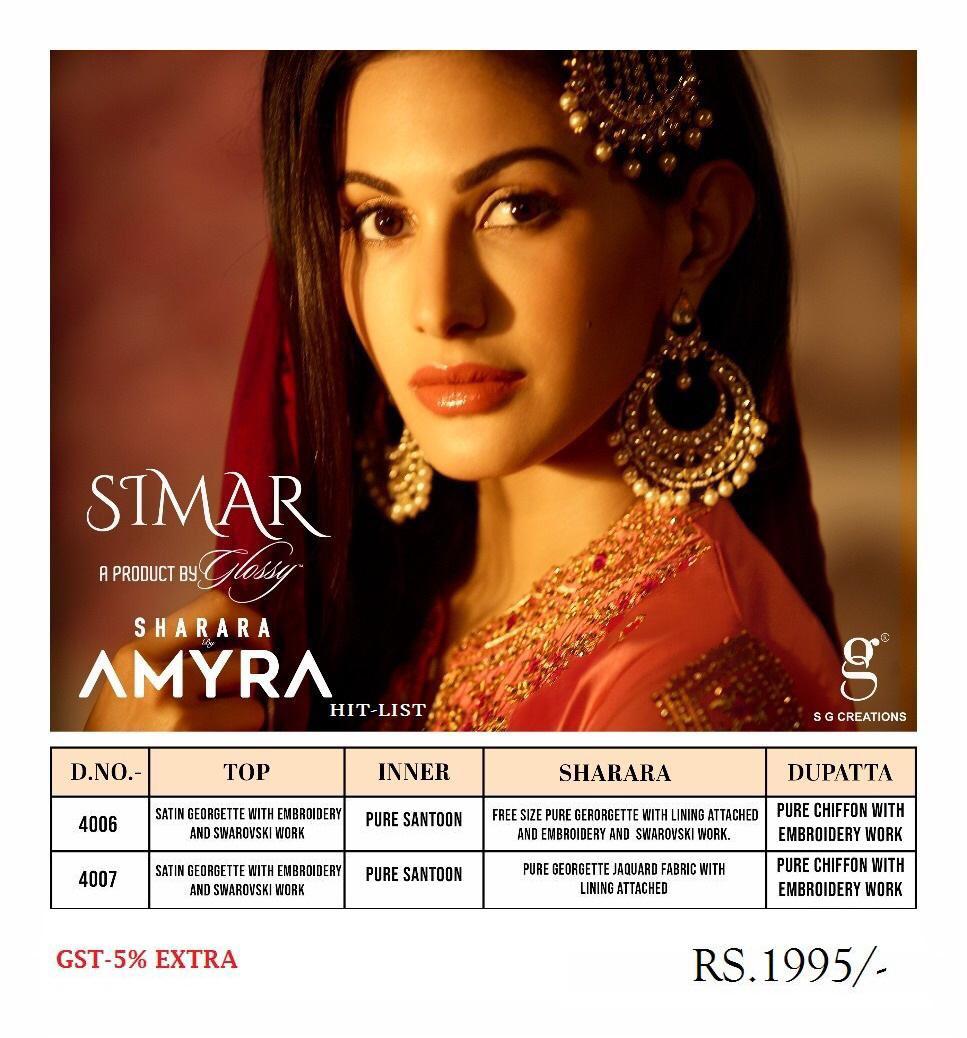 Buy Online Sarara Amyra Hit List By Glossy 4006 Series Designer Party Wear Satin Georgette Sarara Suit Collection Wholesaler Surat 2 Pcs of Full Catalogue at Wholesale Price. Looking for Sarara Amyra Hit List By Glossy 4006 Series Designer Party Wear Satin Georgette Sarara Suit Collection Wholesaler Surat Full Catalouge at Best Price? Buy Now Sarara Amyra Hit List By Glossy 4006 Series Designer Party Wear Satin Georgette Sarara Suit Collection Wholesaler Surat at Wholesale Rate of Rs 3990 with Total 2 Pcs from authroized dealer and supplier of GLOSSY Brand. Cost of Each piece is just only Rs 1995 which is very low and affordable price to resale the product in your retail store ,This is Surat based Wholesale Supplier & Dealer of GLOSSY Brand. Click on Brand name to Know more about GLOSSY Brand's products.Call or Whatsapp on 9898838984 for booking or enquiry
