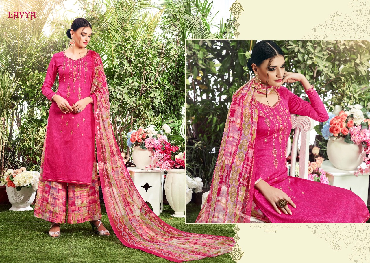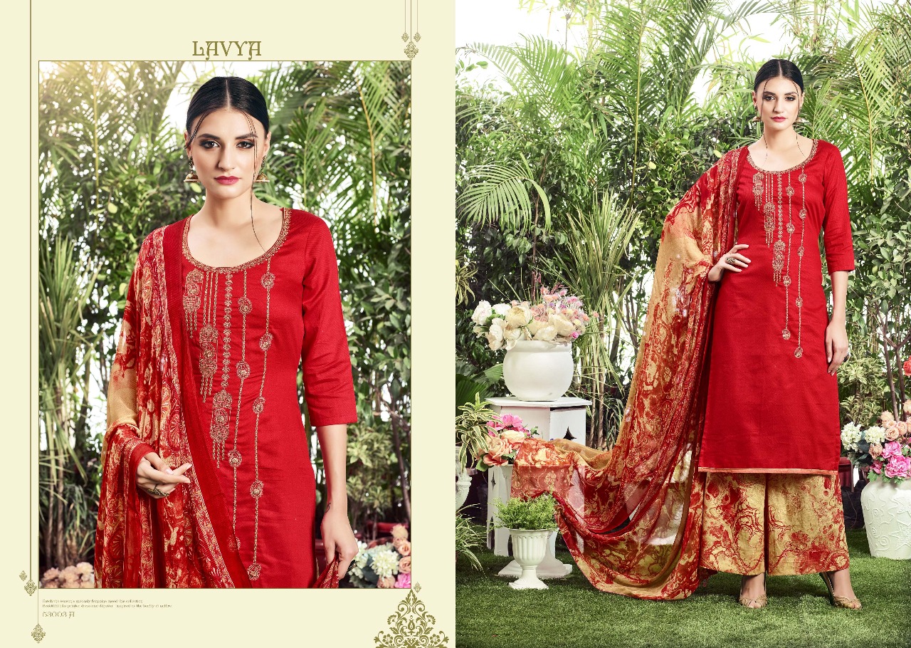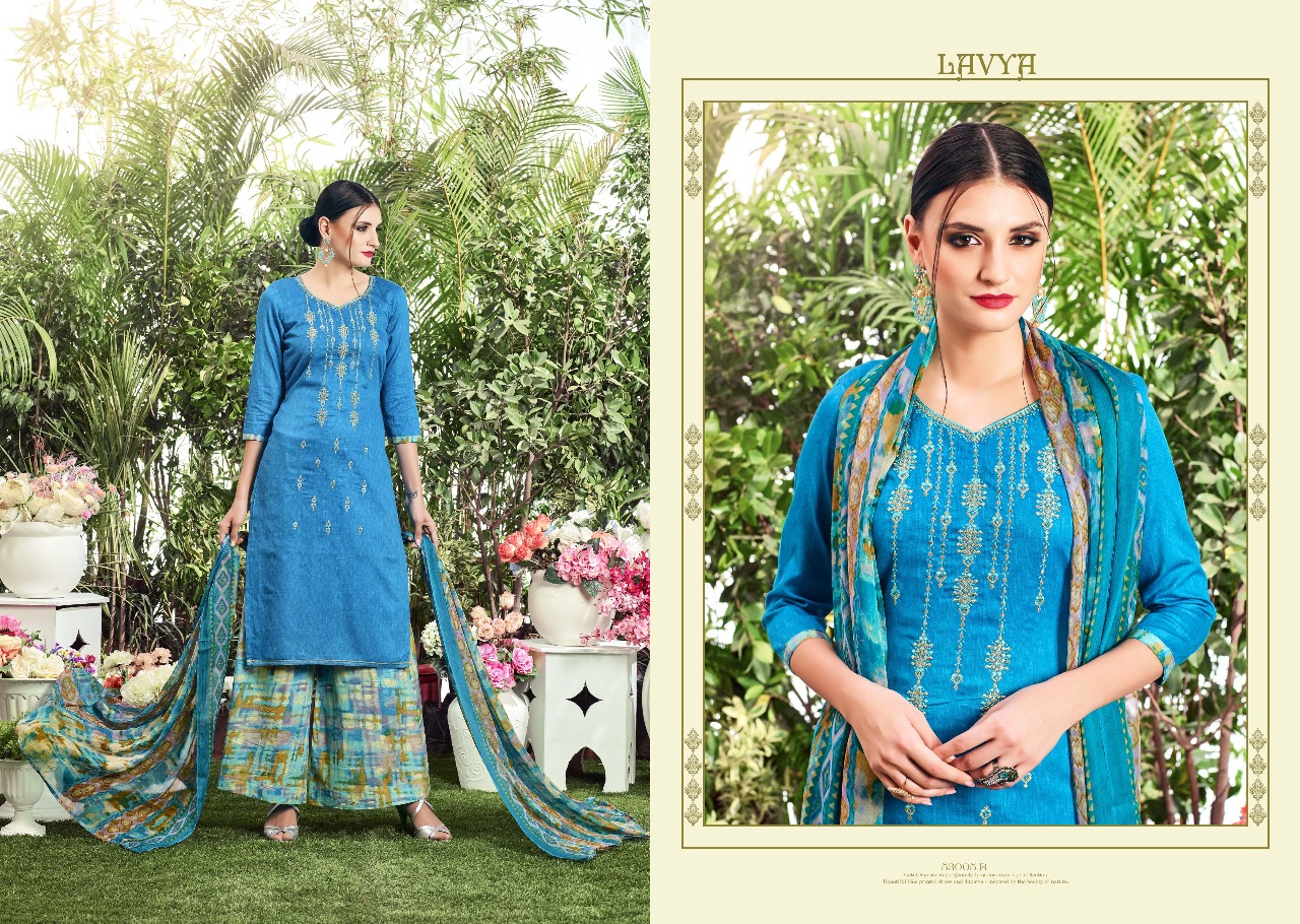 SARGAM PRINTS Presents *LAVYA vol-2* Fabric Details *Top:* JAAM SATIN SELF PRINT WITH DESIGNER EMBROIDERY WORK *Bottom:* COTTON PLAZZO PRINTED *Dupatta:*PURE BAMBERG CHIFFON PRINTED *Designs:* 10PCS *Rate -961? per Pcs . Set to set . GST 5 Percent Extra. *HSN CODE:* 5407. Delivery- 09-04-18. Book your order |