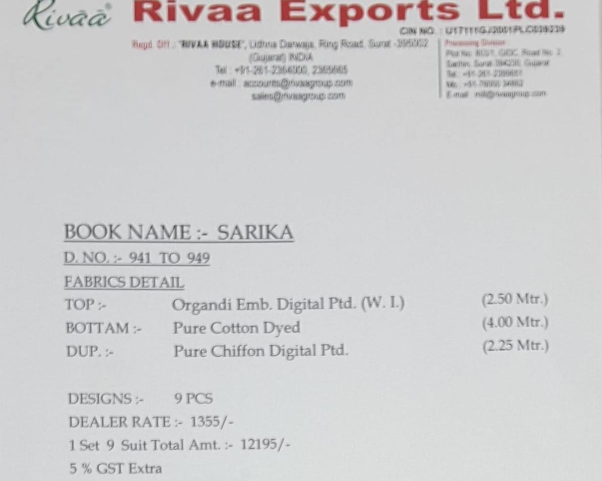 *RIVAA* Presents its new catalogue *SARIKA* TOP-ORGANDI EMVROIDERY DIGITAL PRINT WITH INNER BOTTOM-PURE COTTON DYED DUPATTA-PURE CHIFFON DIGITAL PRINT *SELLING RATE-1355?* (RATELIST ATTACHED) 5%GST APPLICABLE SET TO SET DELIVERY MONDAY |