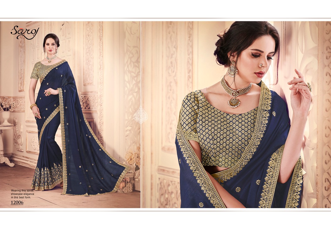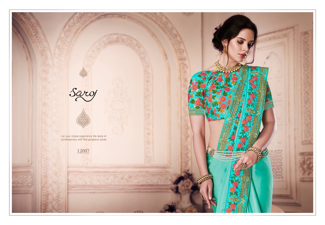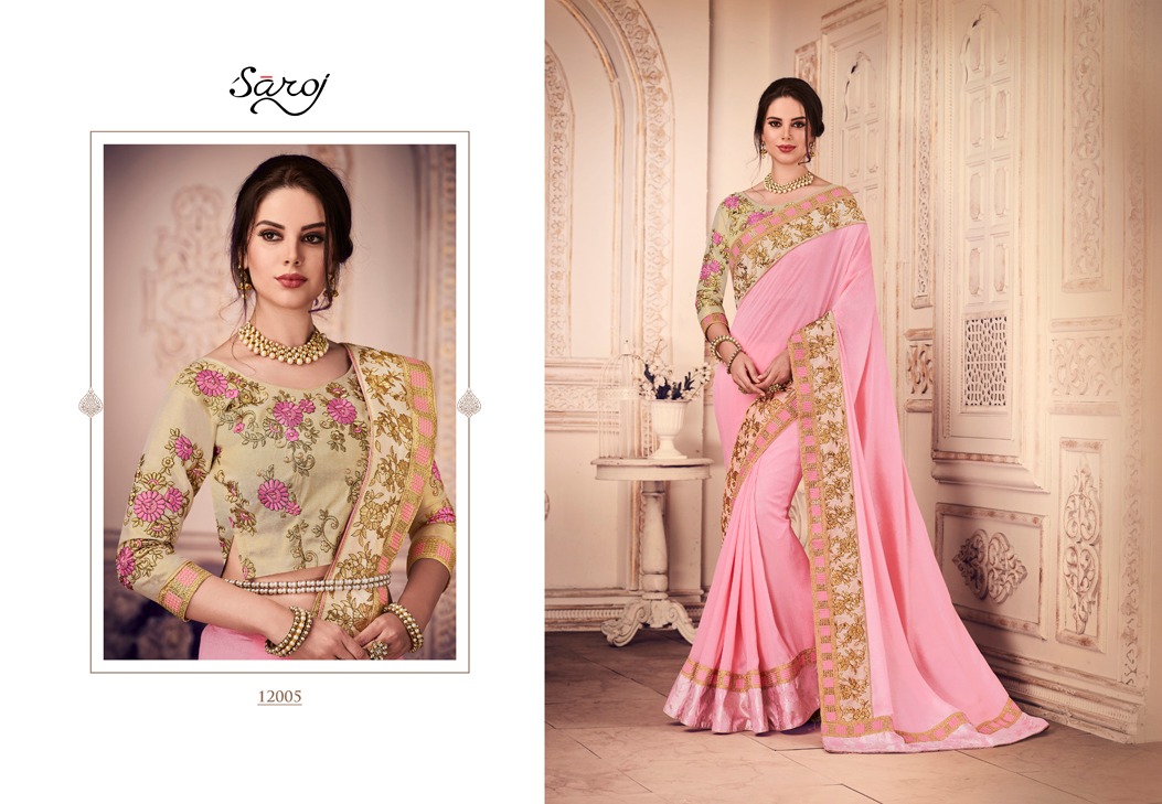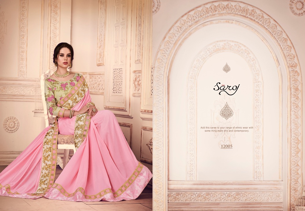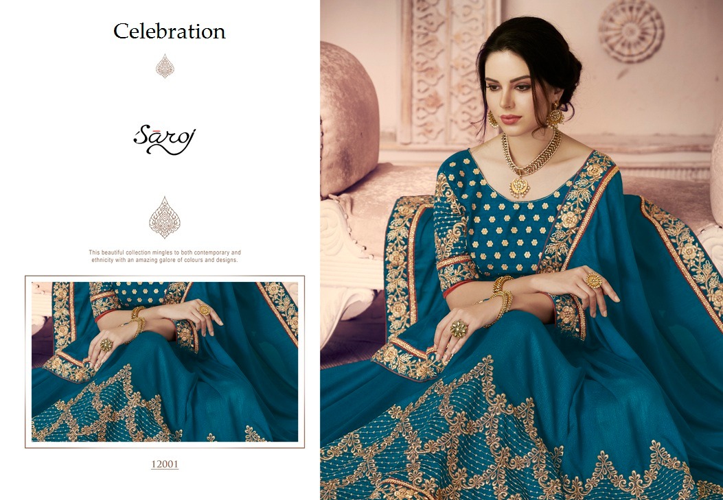 Buy Online Saroj Celebration 12001 Series Designer Party Wear Sarees 8 Pcs of Full Catalogue at Wholesale Price. Looking for Saroj Celebration 12001 Series Designer Party Wear Sarees Full Catalouge at Best Price? Buy Now Saroj Celebration 12001 Series Designer Party Wear Sarees at Wholesale Rate of Rs 17440 with Total 8 Pcs from authroized dealer and supplier of SAROJ SAREE Brand. Cost of Each piece is just only Rs 2180 which is very low and affordable price to resale the product in your retail store ,This is Surat based Wholesale Supplier & Dealer of SAROJ SAREE Brand. Click on Brand name to Know more about SAROJ SAREE Brand's products.Call or Whatsapp on 9898838984 for booking or enquiry