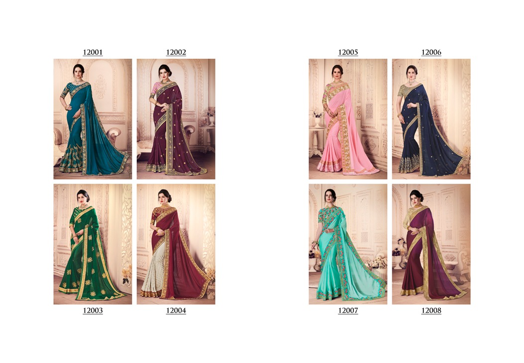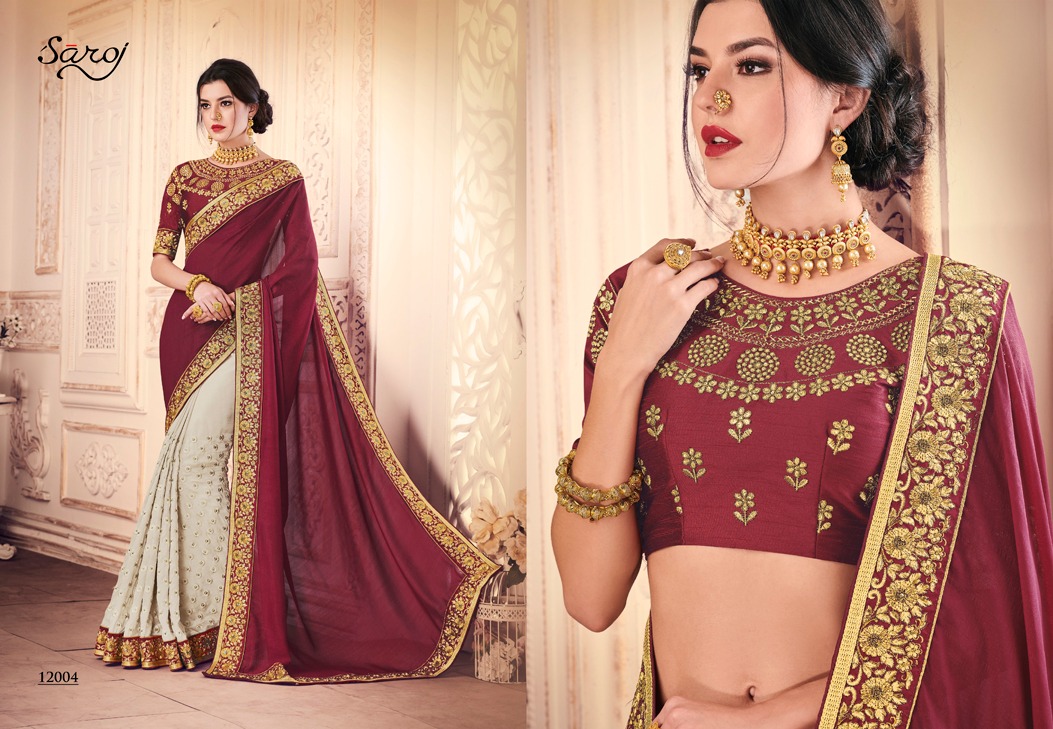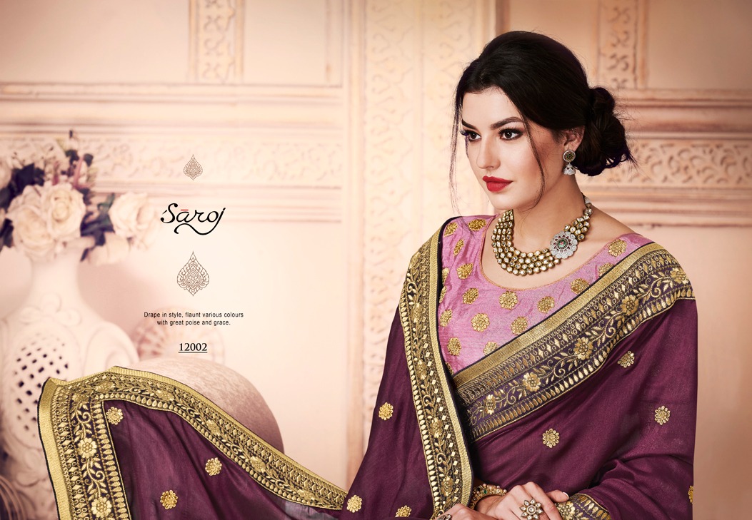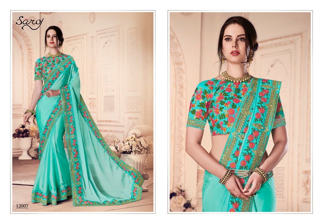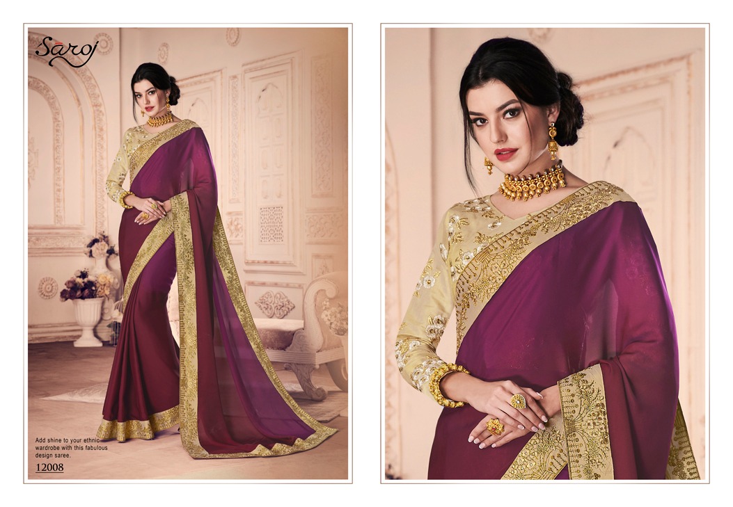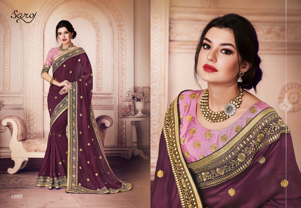 Buy Online Saroj Celebration 12001 Series Designer Party Wear Sarees 8 Pcs of Full Catalogue at Wholesale Price. Looking for Saroj Celebration 12001 Series Designer Party Wear Sarees Full Catalouge at Best Price? Buy Now Saroj Celebration 12001 Series Designer Party Wear Sarees at Wholesale Rate of Rs 17440 with Total 8 Pcs from authroized dealer and supplier of SAROJ SAREE Brand. Cost of Each piece is just only Rs 2180 which is very low and affordable price to resale the product in your retail store ,This is Surat based Wholesale Supplier & Dealer of SAROJ SAREE Brand. Click on Brand name to Know more about SAROJ SAREE Brand's products.Call or Whatsapp on 9898838984 for booking or enquiry