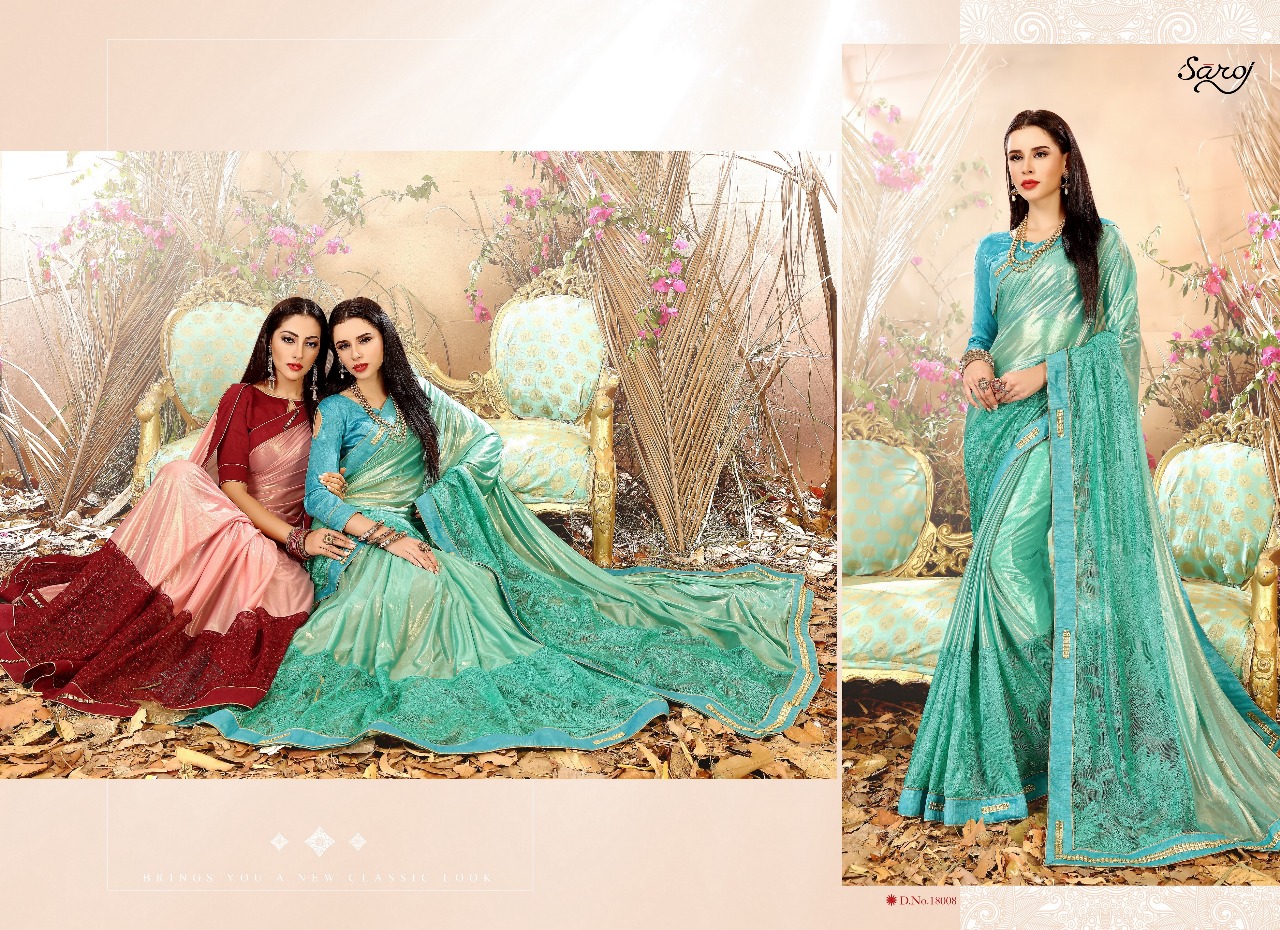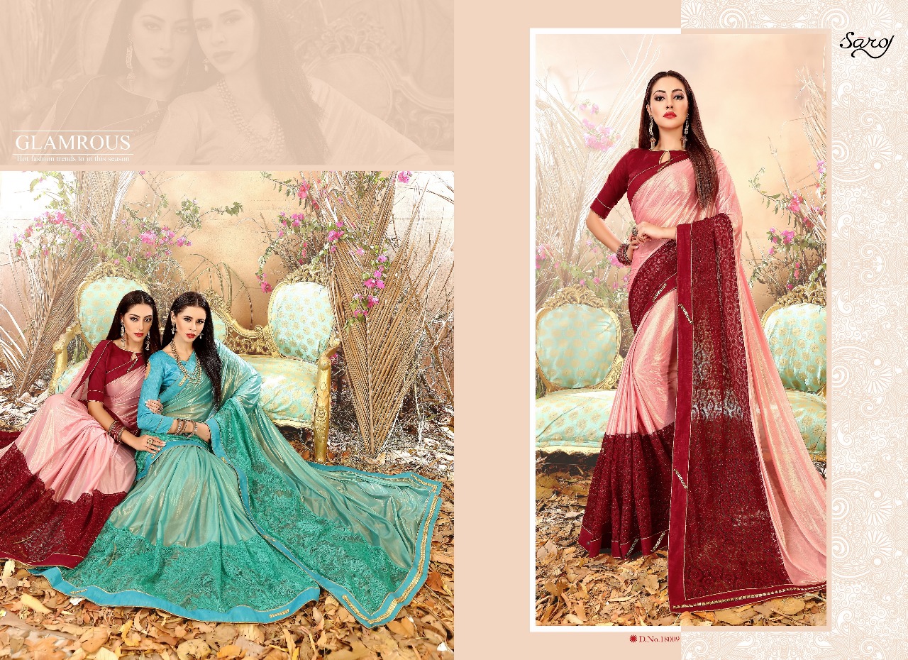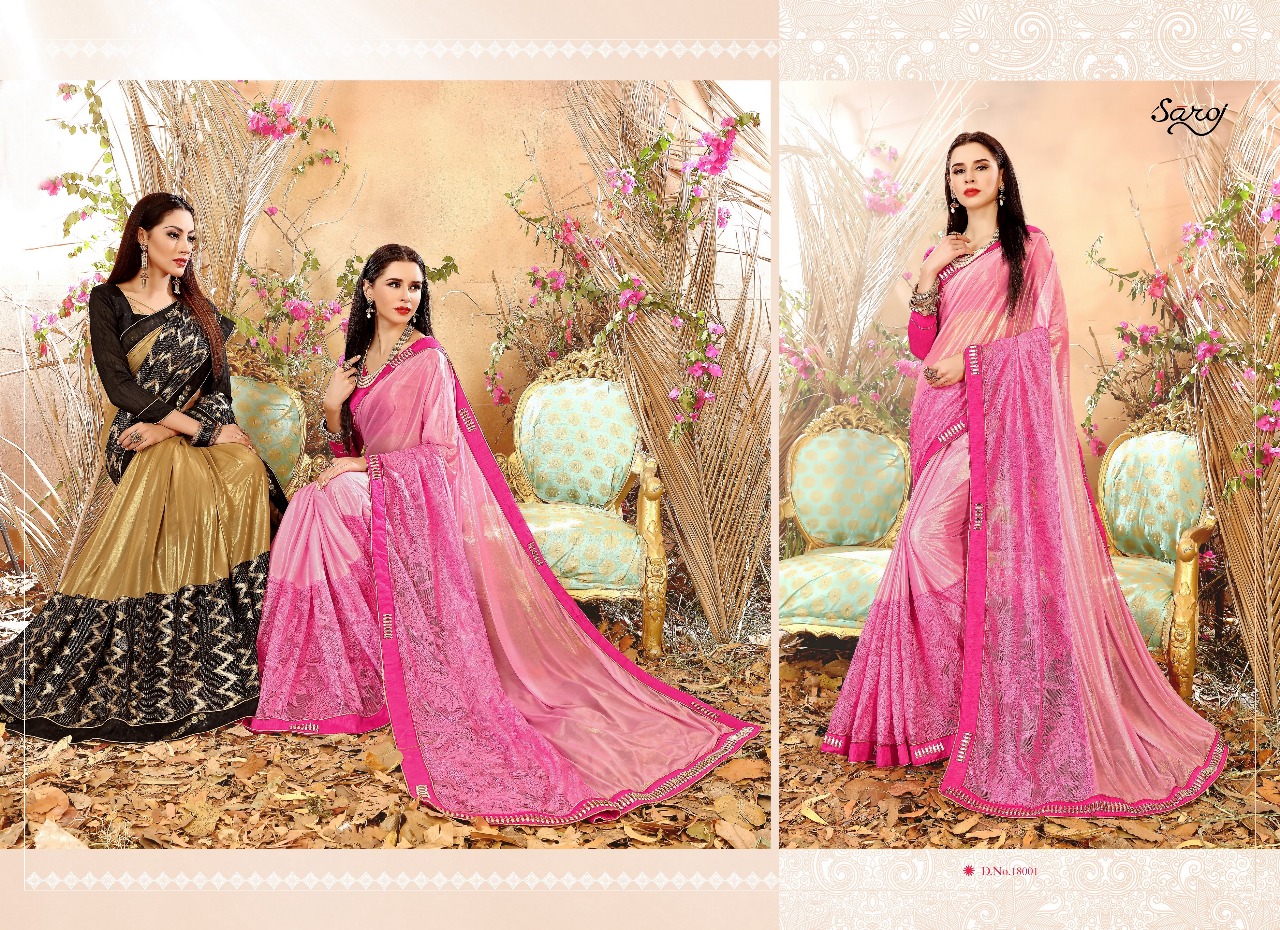 Buy Online Saroj Golden Glory 18001 Series Designer Saree Catlog Wholesale Dealer And Supplier Surat 12 Pcs of Full Catalogue at Wholesale Price. Looking for Saroj Golden Glory 18001 Series Designer Saree Catlog Wholesale Dealer And Supplier Surat Full Catalouge at Best Price? Buy Now Saroj Golden Glory 18001 Series Designer Saree Catlog Wholesale Dealer And Supplier Surat at Wholesale Rate of Rs 9180 with Total 12 Pcs from authroized dealer and supplier of SAROJ SAREE Brand. Cost of Each piece is just only Rs 765 which is very low and affordable price to resale the product in your retail store ,This is Surat based Wholesale Supplier & Dealer of SAROJ SAREE Brand. Click on Brand name to Know more about SAROJ SAREE Brand's products.Call or Whatsapp on 9898838984 for booking or enquiry
