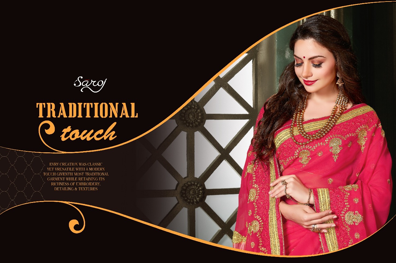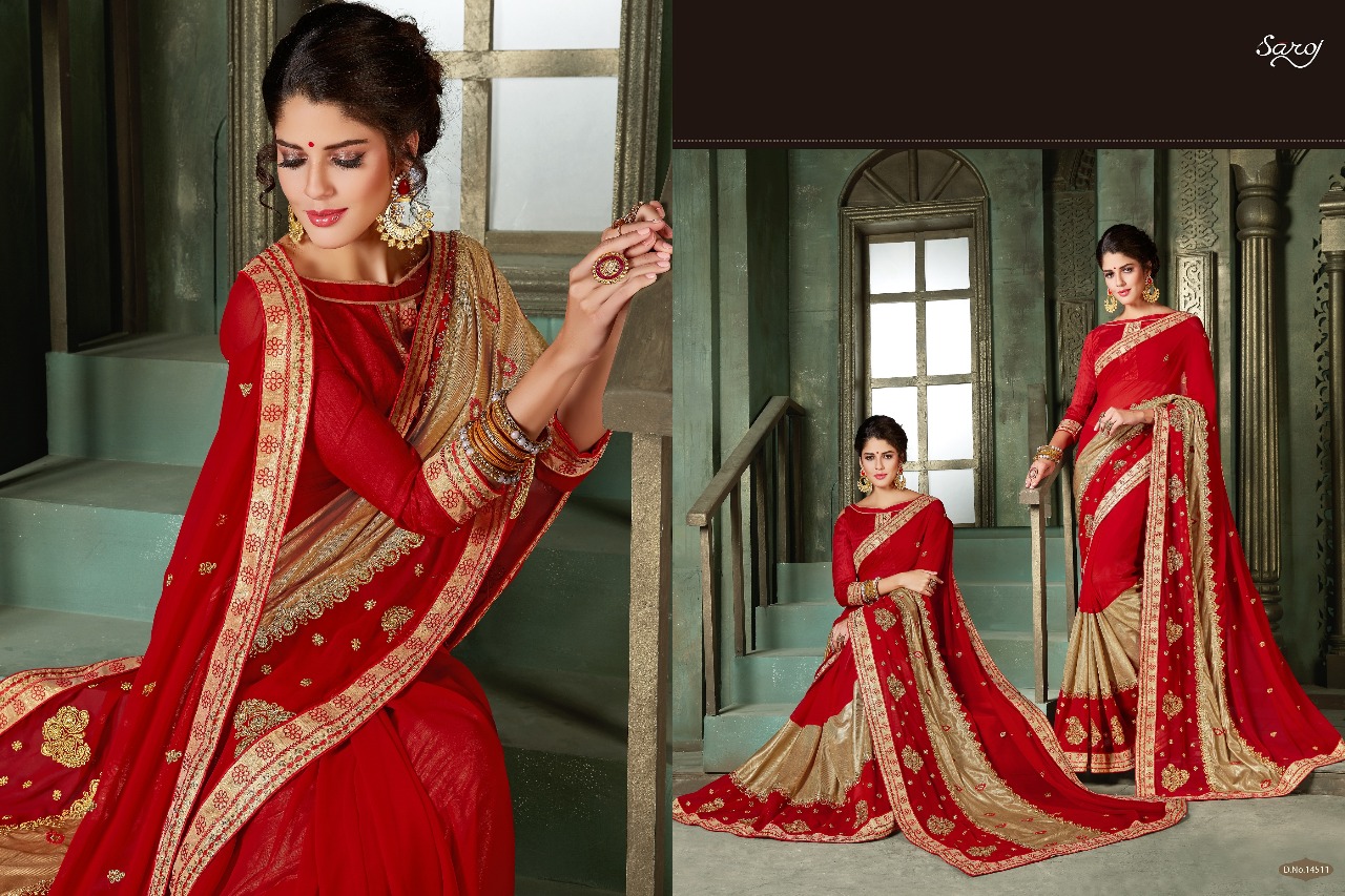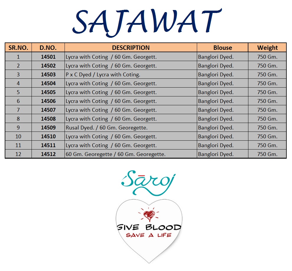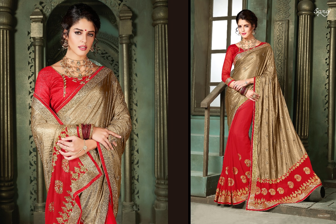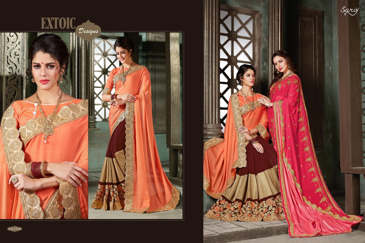Buy Online Saroj Sajawat 14501 Series Designer Party Wesr Sarees Surat 12 Pcs of Full Catalogue at Wholesale Price. Looking for Saroj Sajawat 14501 Series Designer Party Wesr Sarees Surat Full Catalouge at Best Price? Buy Now Saroj Sajawat 14501 Series Designer Party Wesr Sarees Surat at Wholesale Rate of Rs 9720 with Total 12 Pcs from authroized dealer and supplier of SAROJ SAREE Brand. Cost of Each piece is just only Rs 810 which is very low and affordable price to resale the product in your retail store ,This is Surat based Wholesale Supplier & Dealer of SAROJ SAREE Brand. Click on Brand name to Know more about SAROJ SAREE Brand's products.Call or Whatsapp on 9898838984 for booking or enquiry