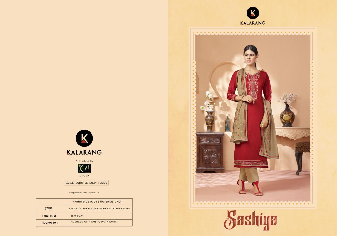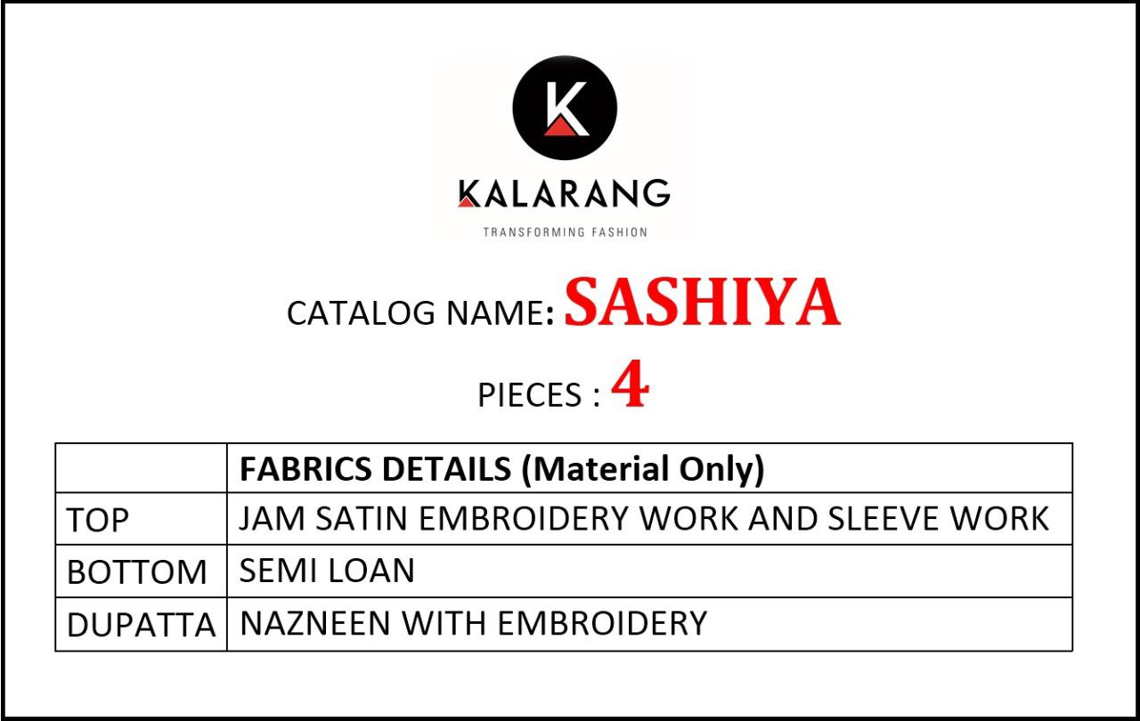 ? Kalarang. has launched Catalog name: Sashiya ? Fabric Details ? ?Top:- Jam Satin Embroidery Work and Sleeve Work ?Bottom:- Semi Loan ?Dupatta:- Nazneen with Embroidery Work ?Total Design:- 4 Rate - 699 per PCÂ?s . Set to set. GST 5 Percent Extra ?Dispatching 5 to 6 days later ?Booking started from now... ?Order yours soon.... |