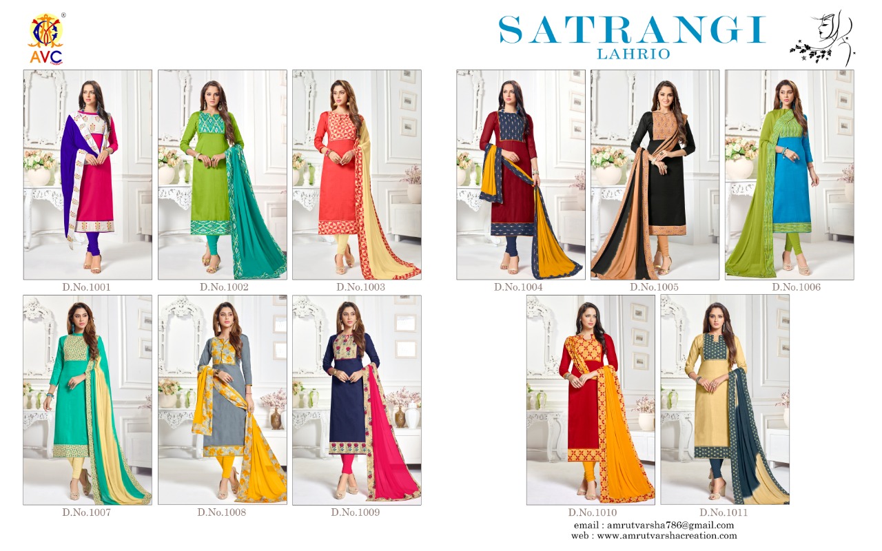 Buy Online Satrangi Laharia By Avc Jacquard Digital Printed Suits Wholesale Supplier And Dealer Gujarat 11 Pcs of Full Catalogue at Wholesale Price. Looking for Satrangi Laharia By Avc Jacquard Digital Printed Suits Wholesale Supplier And Dealer Gujarat Full Catalouge at Best Price? Buy Now Satrangi Laharia By Avc Jacquard Digital Printed Suits Wholesale Supplier And Dealer Gujarat at Wholesale Rate of Rs 6050 with Total 11 Pcs from authroized dealer and supplier of AVC Brand. Cost of Each piece is just only Rs 550 which is very low and affordable price to resale the product in your retail store ,This is Surat based Wholesale Supplier & Dealer of AVC Brand. Click on Brand name to Know more about AVC Brand's products.Call or Whatsapp on 9898838984 for booking or enquiry