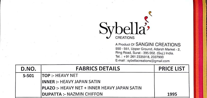Buy Online Saybella S 501 New Colours Designer Party Wear Sarara Suit Collection Wholesale Dealer Surat 3 Pcs of Full Catalogue at Wholesale Price. Looking for Saybella S 501 New Colours Designer Party Wear Sarara Suit Collection Wholesale Dealer Surat Full Catalouge at Best Price? Buy Now Saybella S 501 New Colours Designer Party Wear Sarara Suit Collection Wholesale Dealer Surat at Wholesale Rate of Rs 5985 with Total 3 Pcs from authroized dealer and supplier of SYBELLA Brand. Cost of Each piece is just only Rs 1995 which is very low and affordable price to resale the product in your retail store ,This is Surat based Wholesale Supplier & Dealer of SYBELLA Brand. Click on Brand name to Know more about SYBELLA Brand's products.Call or Whatsapp on 9898838984 for booking or enquiry