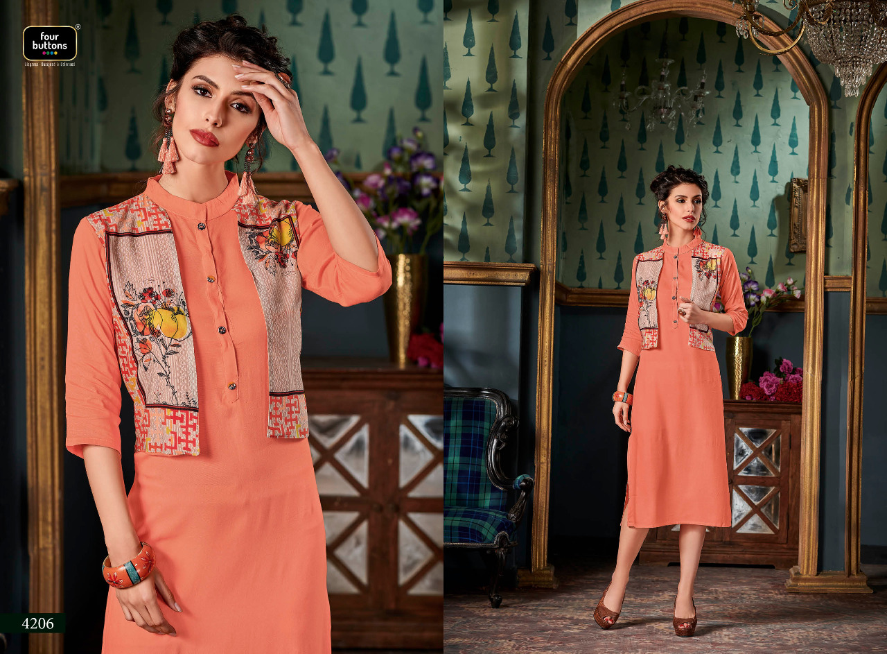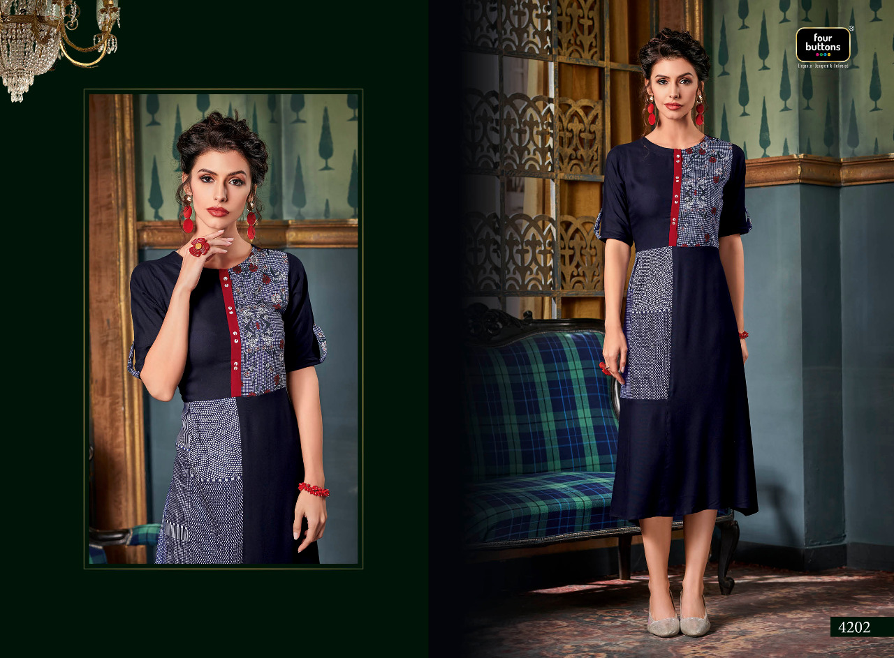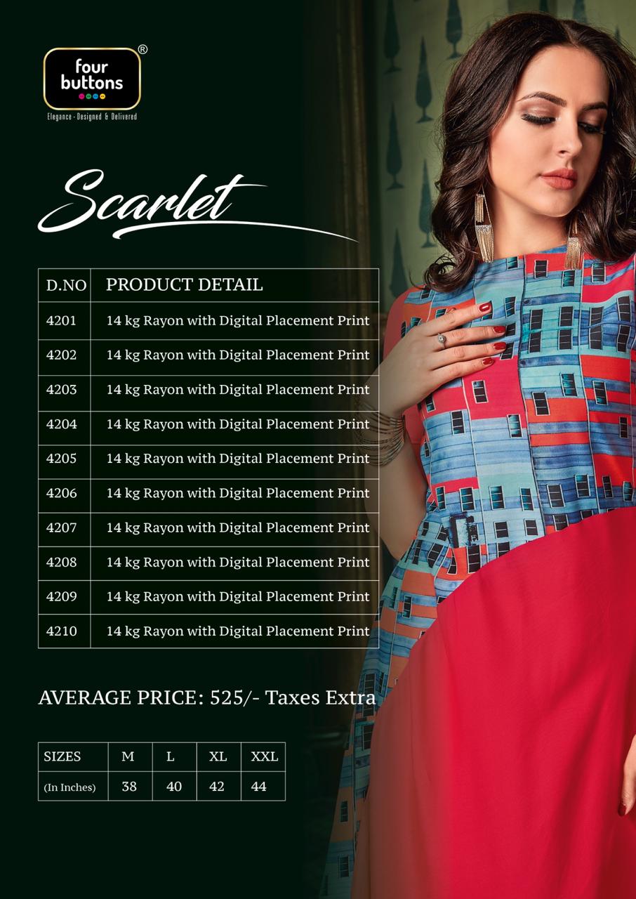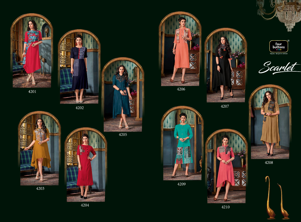 Buy Online Scarlet By Four Buttons Fancy Desinger Kurtis Wholesale Supplier And Dealer Gujarat 10 Pcs of Full Catalogue at Wholesale Price. Looking for Scarlet By Four Buttons Fancy Desinger Kurtis Wholesale Supplier And Dealer Gujarat Full Catalouge at Best Price? Buy Now Scarlet By Four Buttons Fancy Desinger Kurtis Wholesale Supplier And Dealer Gujarat at Wholesale Rate of Rs 5250 with Total 10 Pcs from authroized dealer and supplier of FOUR BUTTONS Brand. Cost of Each piece is just only Rs 525 which is very low and affordable price to resale the product in your retail store ,This is Surat based Wholesale Supplier & Dealer of FOUR BUTTONS Brand. Click on Brand name to Know more about FOUR BUTTONS Brand's products.Call or Whatsapp on 9898838984 for booking or enquiry