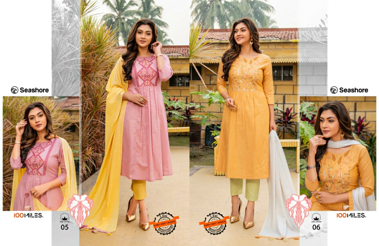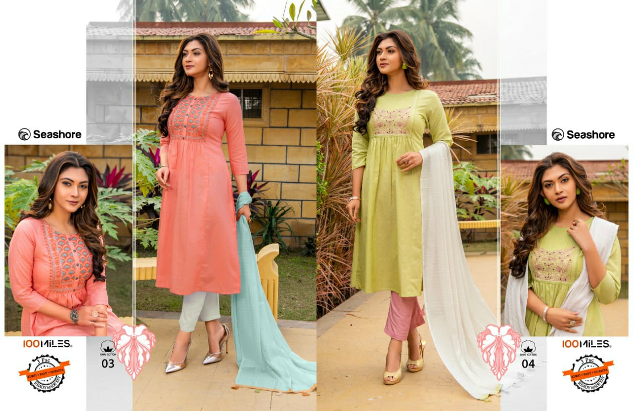 Buy Online Seashore Kurti With Pants And Dupatta By 100 Miles Dealer And Exporter Surat Gujarat 6 Pcs of Full Catalogue at Wholesale Price. Looking for Seashore Kurti With Pants And Dupatta By 100 Miles Dealer And Exporter Surat Gujarat Full Catalouge at Best Price? Buy Now Seashore Kurti With Pants And Dupatta By 100 Miles Dealer And Exporter Surat Gujarat at Wholesale Rate of Rs 4830 with Total 6 Pcs from authroized dealer and supplier of 100 MILES Brand. Cost of Each piece is just only Rs 805 which is very low and affordable price to resale the product in your retail store ,This is Surat based Wholesale Supplier & Dealer of 100 MILES Brand. Click on Brand name to Know more about 100 MILES Brand's products.Call or Whatsapp on 9898838984 for booking or enquiry