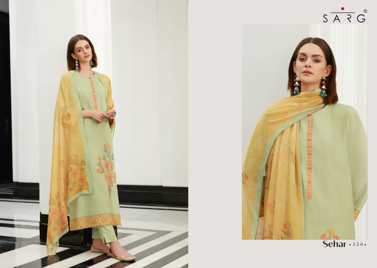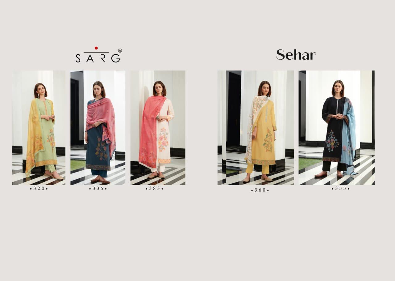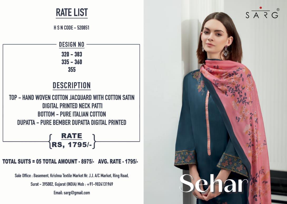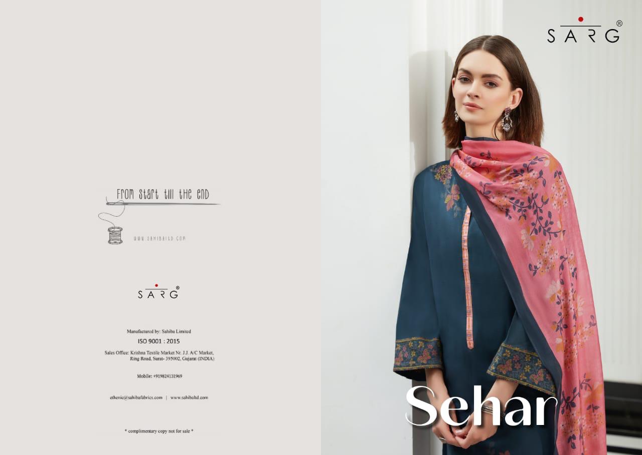 Buy Online Sehar By Sarg By Sahiba Designer Suits Wholesale Suppliers And Dealer From India 5 Pcs of Full Catalogue at Wholesale Price. Looking for Sehar By Sarg By Sahiba Designer Suits Wholesale Suppliers And Dealer From India Full Catalouge at Best Price? Buy Now Sehar By Sarg By Sahiba Designer Suits Wholesale Suppliers And Dealer From India at Wholesale Rate of Rs 8975 with Total 5 Pcs from authroized dealer and supplier of Brand. Cost of Each piece is just only Rs 1795 which is very low and affordable price to resale the product in your retail store ,This is Surat based Wholesale Supplier & Dealer of Brand. Click on Brand name to Know more about Brand's products.Call or Whatsapp on 9898838984 for booking or enquiry