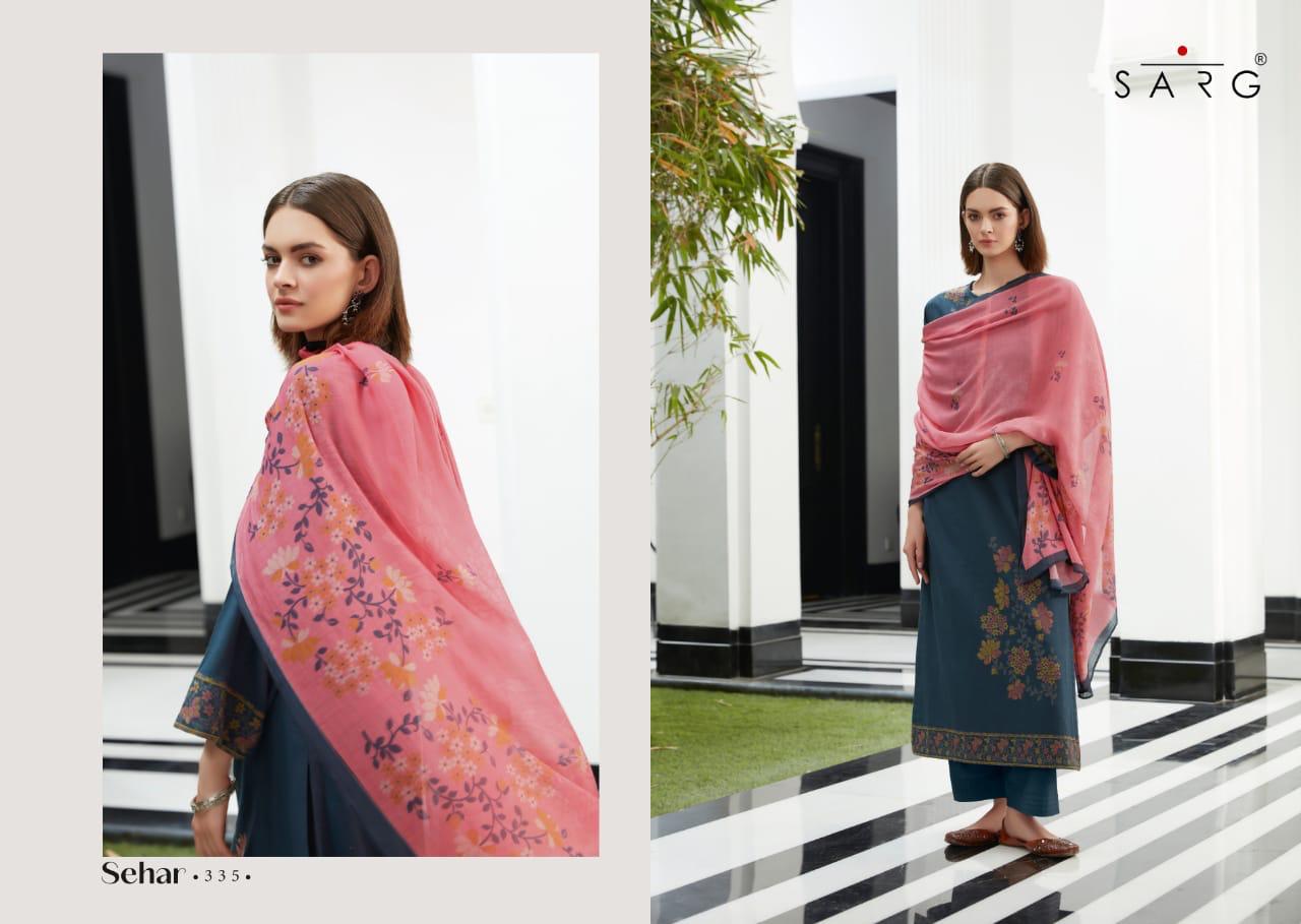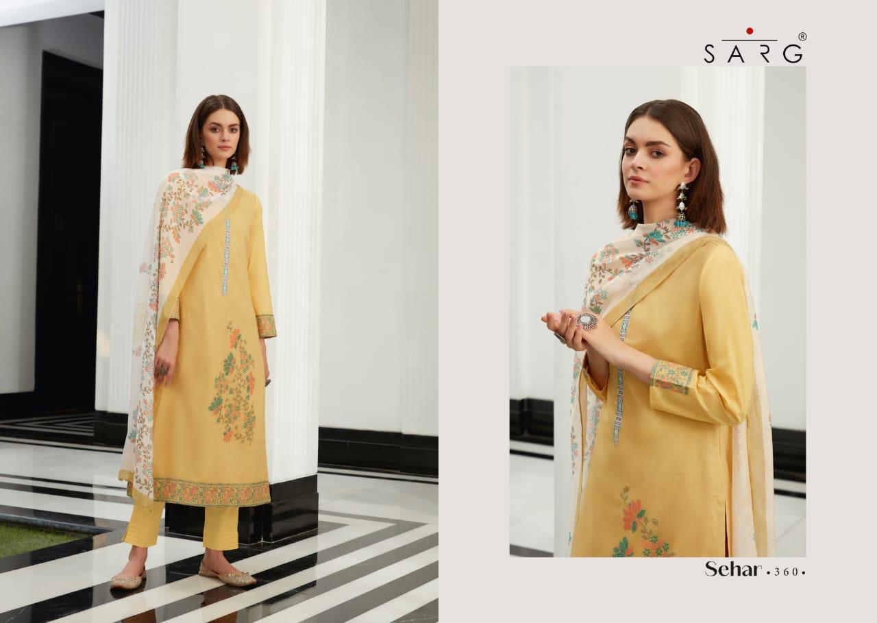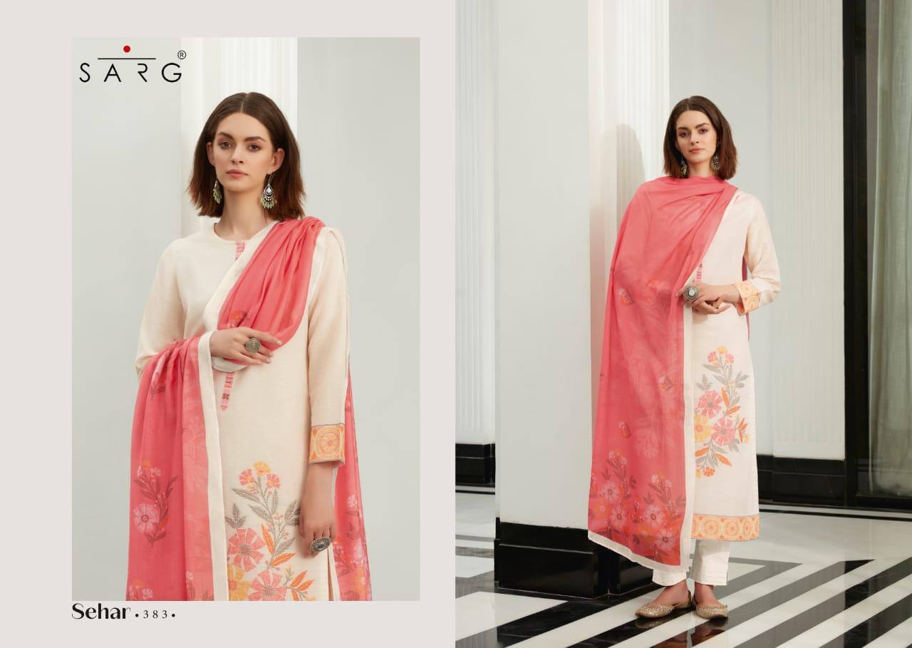Buy Online Sehar By Sarg By Sahiba Designer Suits Wholesale Suppliers And Dealer From India 5 Pcs of Full Catalogue at Wholesale Price. Looking for Sehar By Sarg By Sahiba Designer Suits Wholesale Suppliers And Dealer From India Full Catalouge at Best Price? Buy Now Sehar By Sarg By Sahiba Designer Suits Wholesale Suppliers And Dealer From India at Wholesale Rate of Rs 8975 with Total 5 Pcs from authroized dealer and supplier of Brand. Cost of Each piece is just only Rs 1795 which is very low and affordable price to resale the product in your retail store ,This is Surat based Wholesale Supplier & Dealer of Brand. Click on Brand name to Know more about Brand's products.Call or Whatsapp on 9898838984 for booking or enquiry
