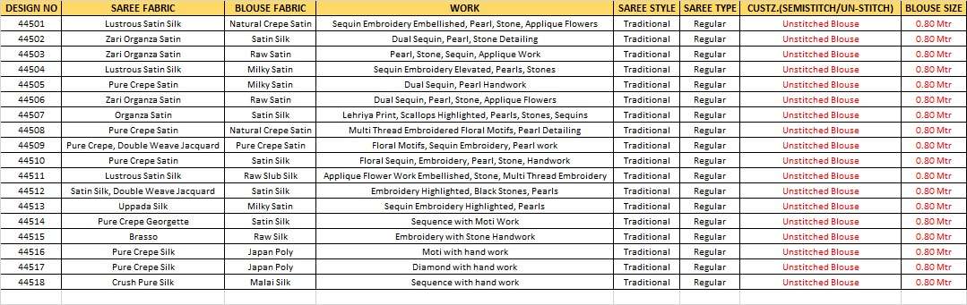 *PRICE :-* *44501-2095/-* *44502-2265/-* *44503-2585/-* *44504-2265/-* *44505-2255/-* *44506-2685/-* *44507-2685/-* *44508-2345/-* *44509-2375/-* *44510-2045/-* *44511-2655/-* *44512-2655/-* *44513-2655/-* *44514-2085/-* *44515-1635/-* *44516-2095/-* *44517-1925/-* *44518-2095/-* +*5% GST EXTRA*