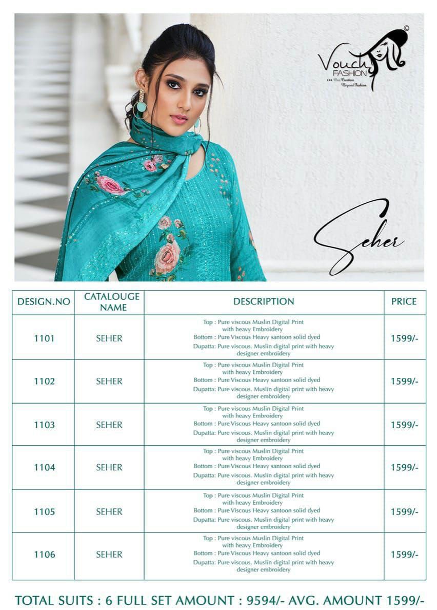 Buy Online Seher Series 1101 To 1106 By Vouch Fashion Single And Set Stockiest And Supplier From Surat 6 Pcs of Full Catalogue at Wholesale Price. Looking for Seher Series 1101 To 1106 By Vouch Fashion Single And Set Stockiest And Supplier From Surat Full Catalouge at Best Price? Buy Now Seher Series 1101 To 1106 By Vouch Fashion Single And Set Stockiest And Supplier From Surat at Wholesale Rate of Rs 9594 with Total 6 Pcs from authroized dealer and supplier of Brand. Cost of Each piece is just only Rs 1599 which is very low and affordable price to resale the product in your retail store ,This is Surat based Wholesale Supplier & Dealer of Brand. Click on Brand name to Know more about Brand's products.Call or Whatsapp on 9898838984 for booking or enquiry