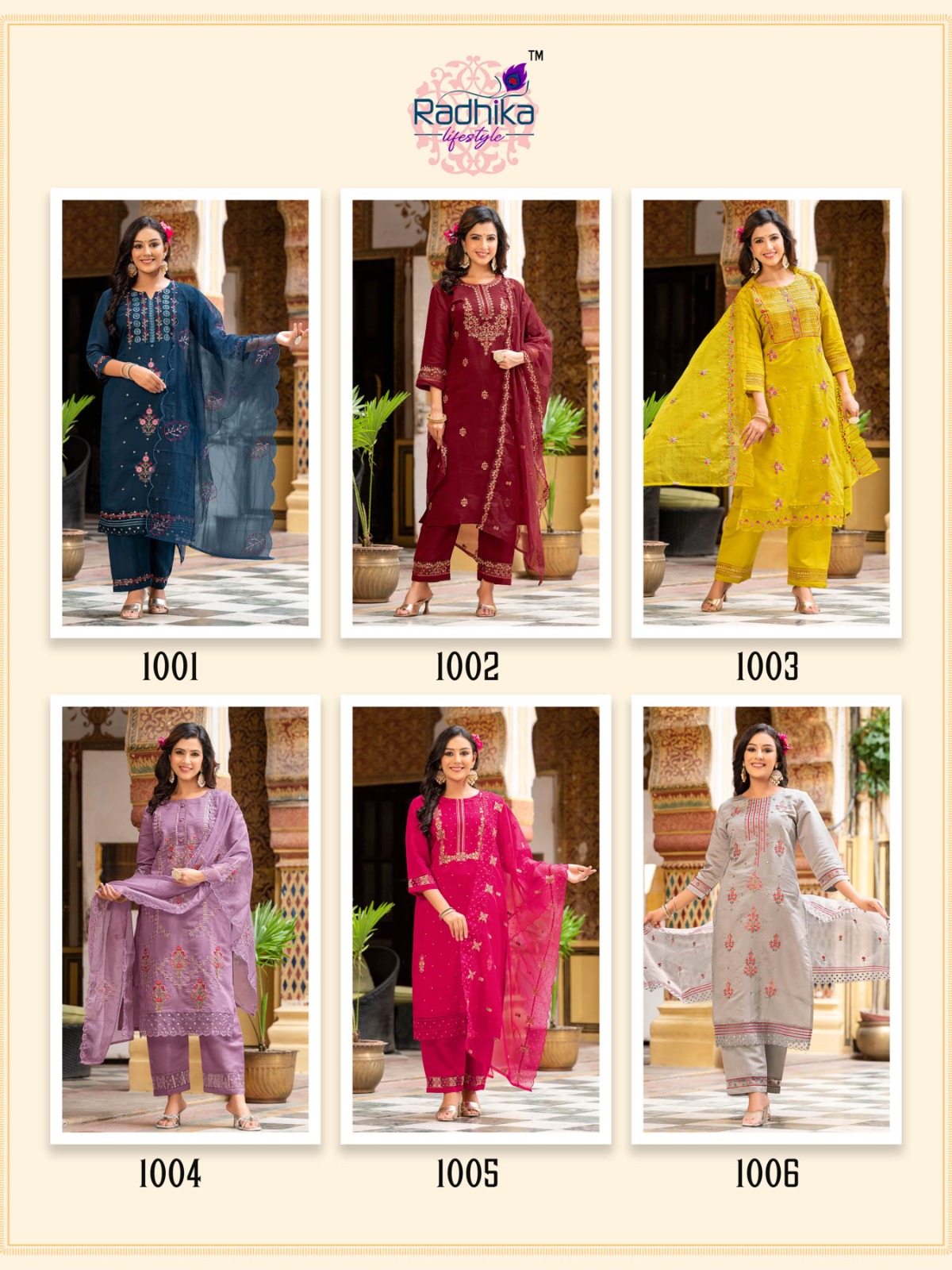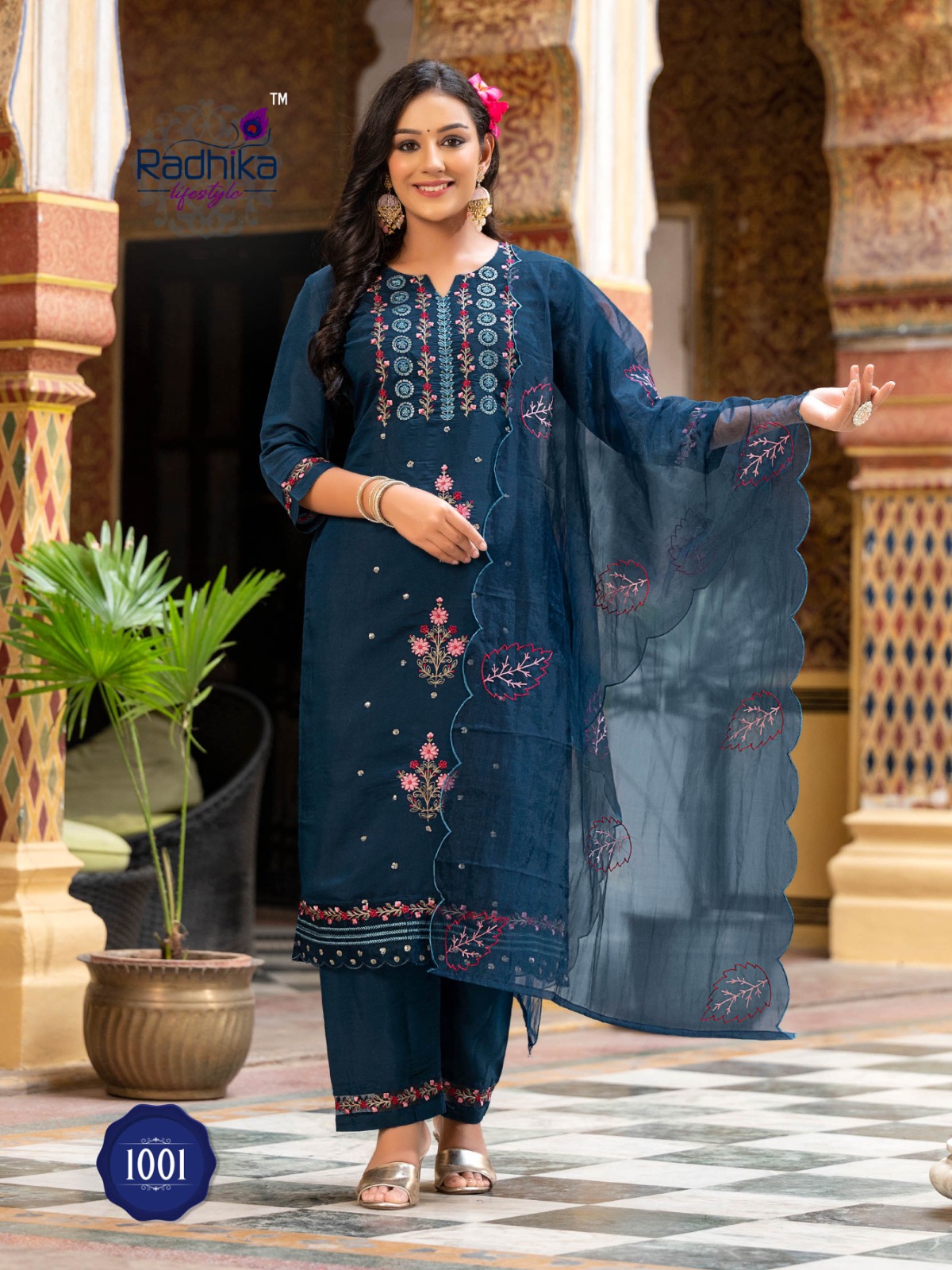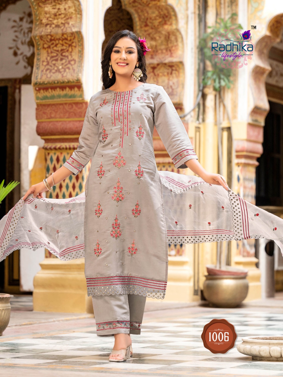 RADHIKA LIFE STYLE *SEHNAZ ???-1* ?KURTI PANT WITH DUPATTA ?DETAILS ?TOP PANTFABRIC - PURE ROMAN SILK WITH INNER ORGANZA DUPPTTA WITH WORK ?WORK TYPE - EMBROIDERY WORK WITH ORGANZA LACE ?SIZE - S,M,L,XL,XXL, ?DESIGN - 6?? Rate:- 1??1??9??9???GST* |
