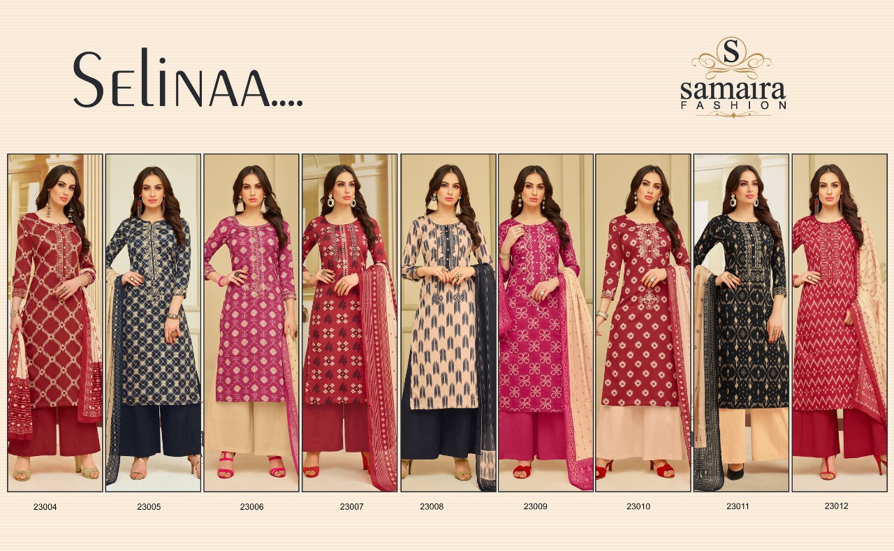 Buy Online Selinaa By Samaira 23004 Series Fancy Heavy Chanderi Printed Salwar Kameez Catlog Wholesale Dealer Surat 9 Pcs of Full Catalogue at Wholesale Price. Looking for Selinaa By Samaira 23004 Series Fancy Heavy Chanderi Printed Salwar Kameez Catlog Wholesale Dealer Surat Full Catalouge at Best Price? Buy Now Selinaa By Samaira 23004 Series Fancy Heavy Chanderi Printed Salwar Kameez Catlog Wholesale Dealer Surat at Wholesale Rate of Rs 4725 with Total 9 Pcs from authroized dealer and supplier of Samaira Fashion Brand. Cost of Each piece is just only Rs 525 which is very low and affordable price to resale the product in your retail store ,This is Surat based Wholesale Supplier & Dealer of Samaira Fashion Brand. Click on Brand name to Know more about Samaira Fashion Brand's products.Call or Whatsapp on 9898838984 for booking or enquiry