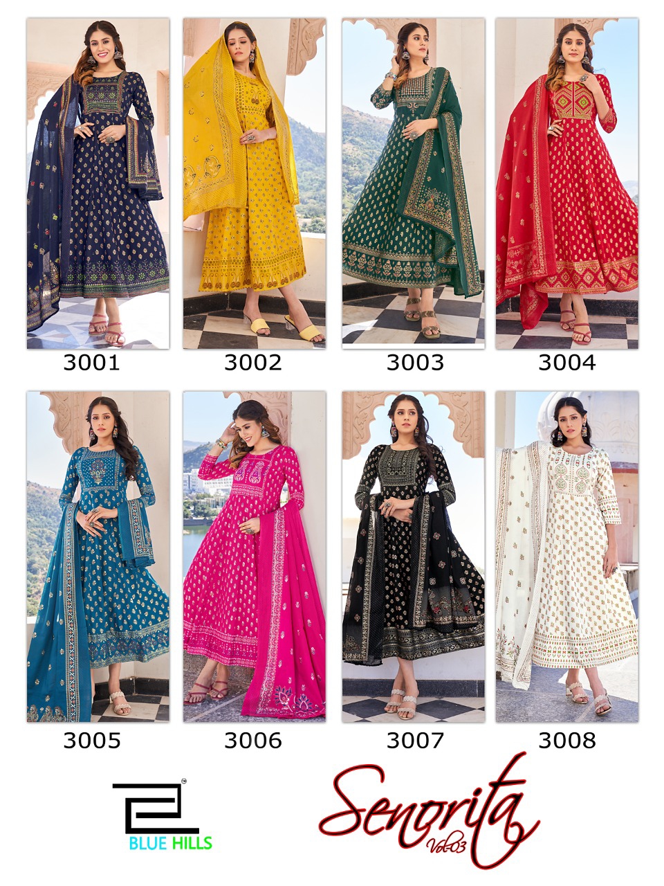 Buy Online Senorita Vol 3 By Blue Hills Long Gown Tipe Kurti With Duppata 8 Pcs of Full Catalogue at Wholesale Price. Looking for Senorita Vol 3 By Blue Hills Long Gown Tipe Kurti With Duppata Full Catalouge at Best Price? Buy Now Senorita Vol 3 By Blue Hills Long Gown Tipe Kurti With Duppata at Wholesale Rate of Rs 6360 with Total 8 Pcs from authroized dealer and supplier of Brand. Cost of Each piece is just only Rs 795 which is very low and affordable price to resale the product in your retail store ,This is Surat based Wholesale Supplier & Dealer of Brand. Click on Brand name to Know more about Brand's products.Call or Whatsapp on 9898838984 for booking or enquiry
